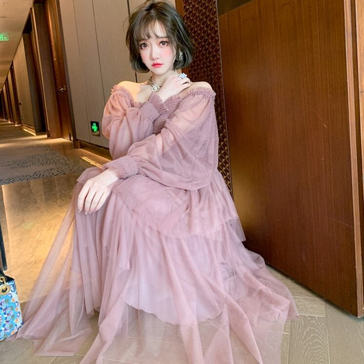 (色とサイズの選択可) レディース ドレス ワンピース ハイウエスト ランタンスリーブ ミドル丈スカート メッシュスカート ピンク ブラック 清楚 上品 かわいい 可愛い 大人かわいい 大人可愛い デート 通勤服 女子会 20代 30代 お出かけ 2color | Chère