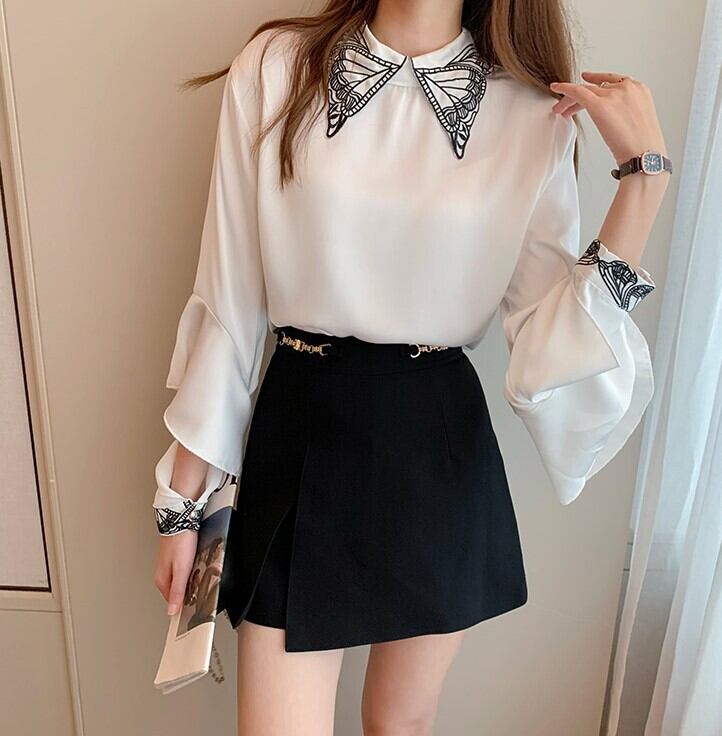新作 レディース Miuco 襟刺繍 ラペルシャツ 2color ブラック ホワイト 襟付き こなれ感 清潔感 光沢シャツ エレガント きれい 大人かわいい 長袖 フレアスリーブ 大人女子 | Chère