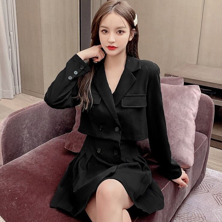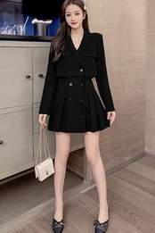 (色とサイズ選択可) レディース ダブルブレスト ワンピース セットアップスーツ 長袖 襟付き フォーマル 通勤 パーティー ジャケット ダブルボタン プリーツスカート スカート 大人女子 こなれ感 | Chère