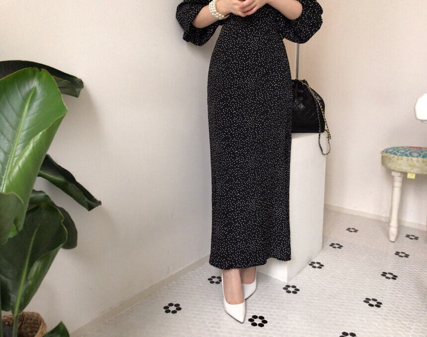 【レトロ風♪】Vネックタイトロングスカートドットワンピース ドット柄 ホルンスリーブ マキシ丈 お出かけ 通勤 セクシー タイト 女子会 フォーマル パーティー 大人かわいい 大人女子 こなれ感 | Chère