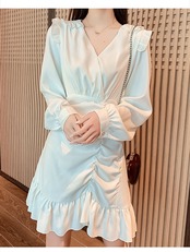 (色とサイズが選択可) レディース フリル ドレス ワンピース ホワイト ブラック 2color Vネック ショート丈 デート お出かけ 通勤服 10代 20代 かわいい 可愛い 大人かわいい 大人可愛い