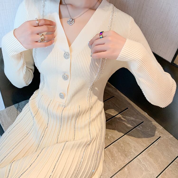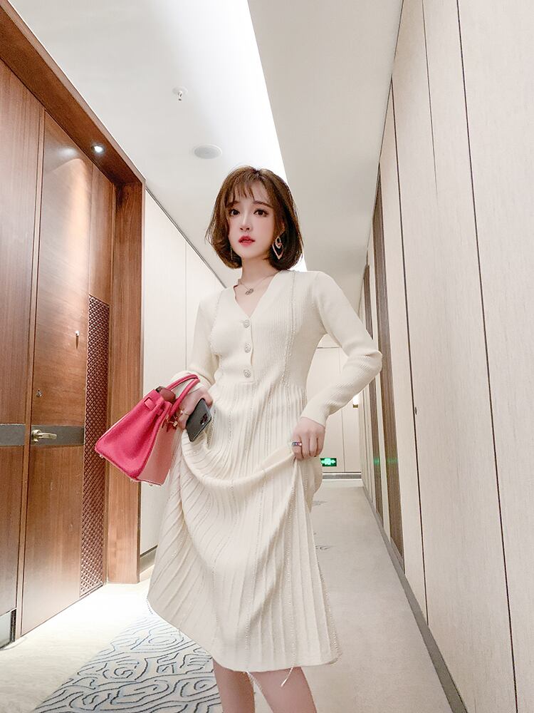 (サイズが選択可) レディース ニットワンピース Vネック ハイウエスト プリーツ ホワイト 1color シンプル 上品 清楚 デート お出かけ 通勤 10代 20代 かわいい 可愛い 大人かわいい 大人可愛い | Chère