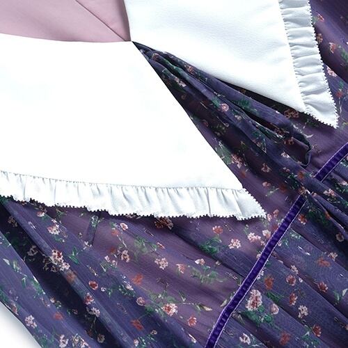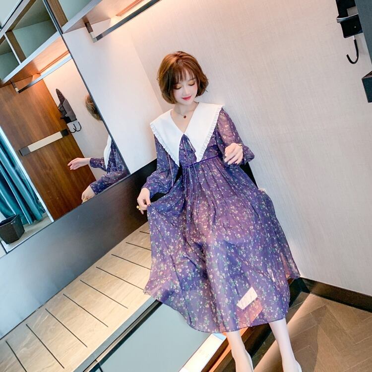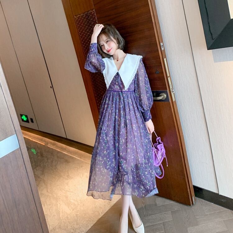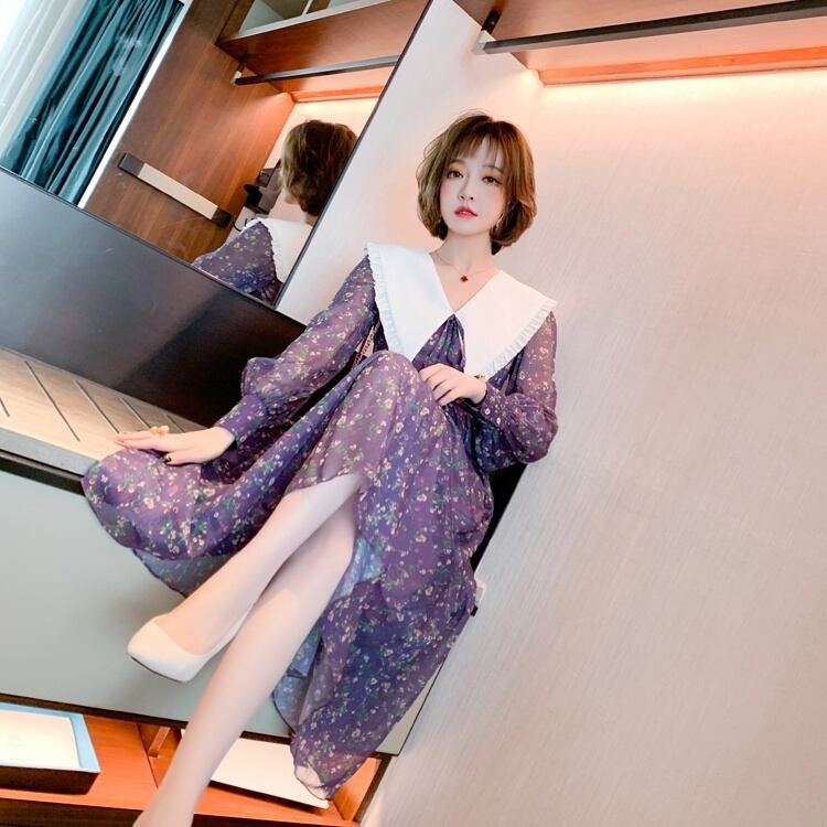 レディース 新作 小花柄 フレアワンピース プリント ワンピース ミモレ丈 ブルー 大きな襟 白い襟 フリル 長袖 ポリエステル 透け感 かわいい 可愛い 大人可愛い 上品 大人 お洒落 ラブリー キュート エレガント 主役級 存在感 母の日 ママ 10代 20代 30代 40代 お出かけ 通勤 OL 旅行 リゾート イベント プレゼント ギフト モテ | Chère