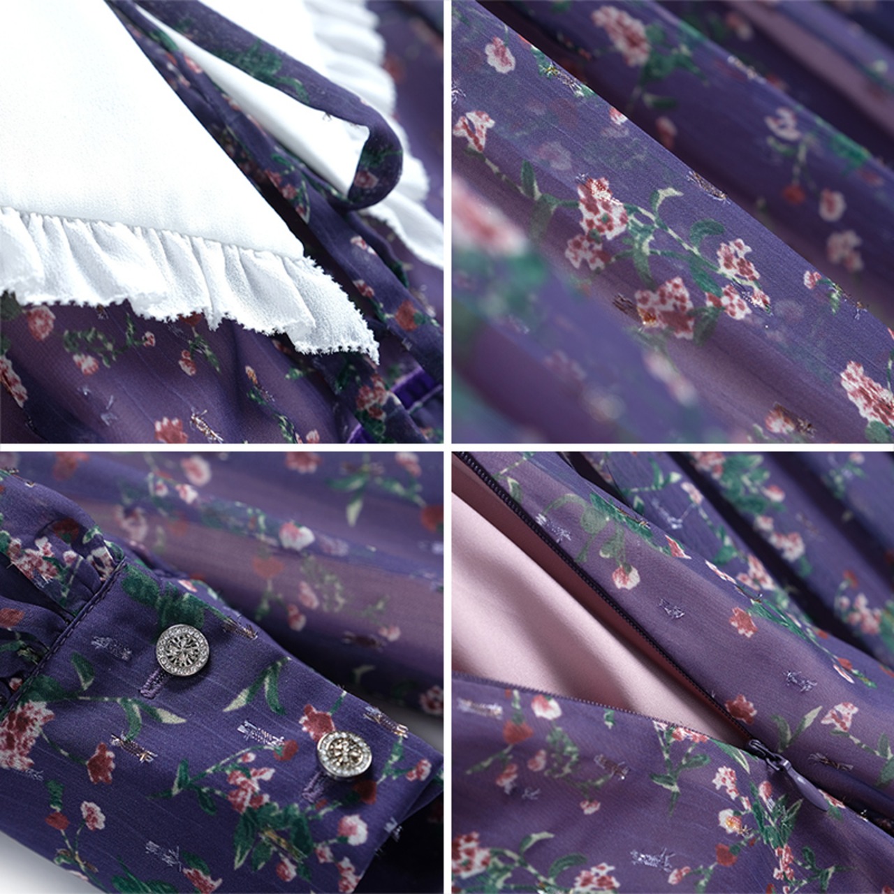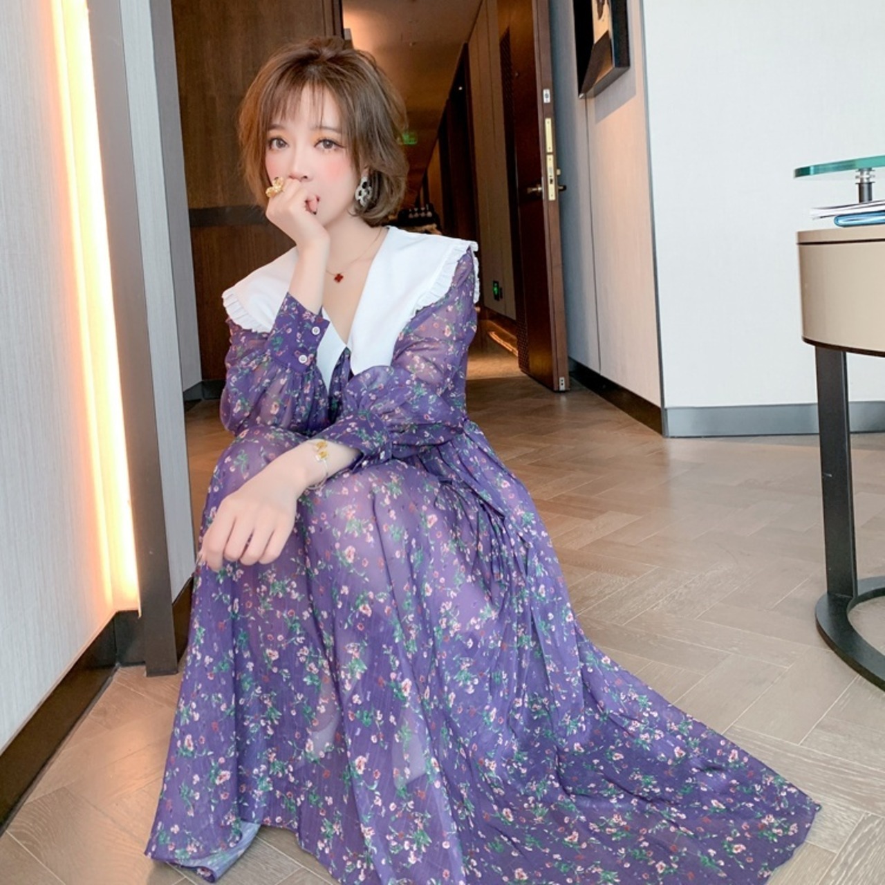 レディース 新作 小花柄 フレアワンピース プリント ワンピース ミモレ丈 ブルー 大きな襟 白い襟 フリル 長袖 ポリエステル 透け感 かわいい 可愛い 大人可愛い 上品 大人 お洒落 ラブリー キュート エレガント 主役級 存在感 母の日 ママ 10代 20代 30代 40代 お出かけ 通勤 OL 旅行 リゾート イベント プレゼント ギフト モテ