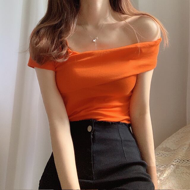 (3色選択可) 韓国系 トップス カットソー 半袖 オフショルダー オフショル タイト 大人可愛い 大人女子 こなれ感 ラブリー キュート 個性的 セクシー 主役級 存在感 オレンジ オフホワイト ブラック 無地 レディース 10代 20代 30代 通勤 イベント リゾート 旅行 モテ 流行 インスタ映え | Chère