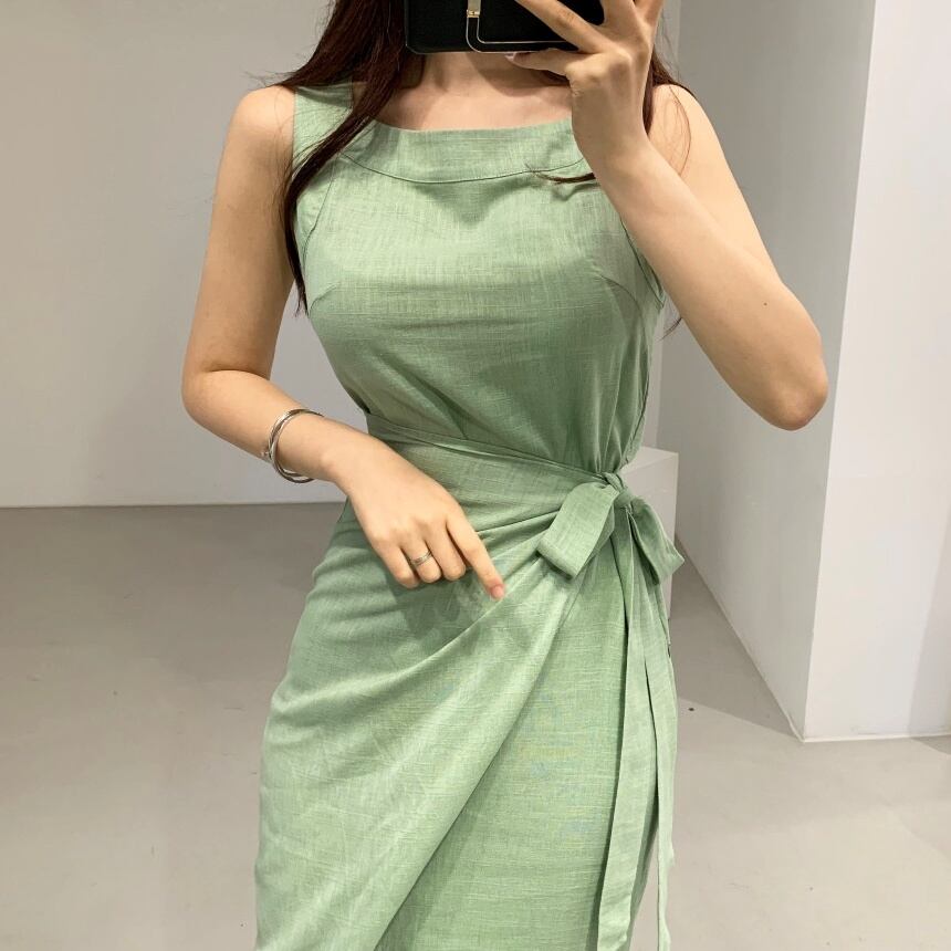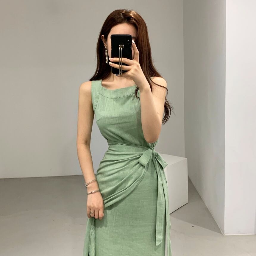 (サイズが選択可) 韓国系 ワンピース ロング丈 ノースリーブ 袖なし ラウンドネック Iライン リボン 綿 きれいめ シンプル 大人 上品 おしゃれ お洒落 大人可愛い 大人女子 こなれ感 個性的 クール エレガント 主役級 グリーン S M L 大人カラー 春カラー ママ レディース 10代 20代 30代 40代 OL 通勤 デート おでかけ 旅行 リゾート | Chère