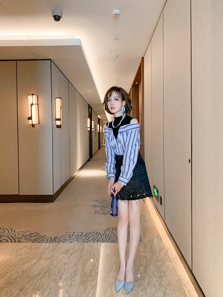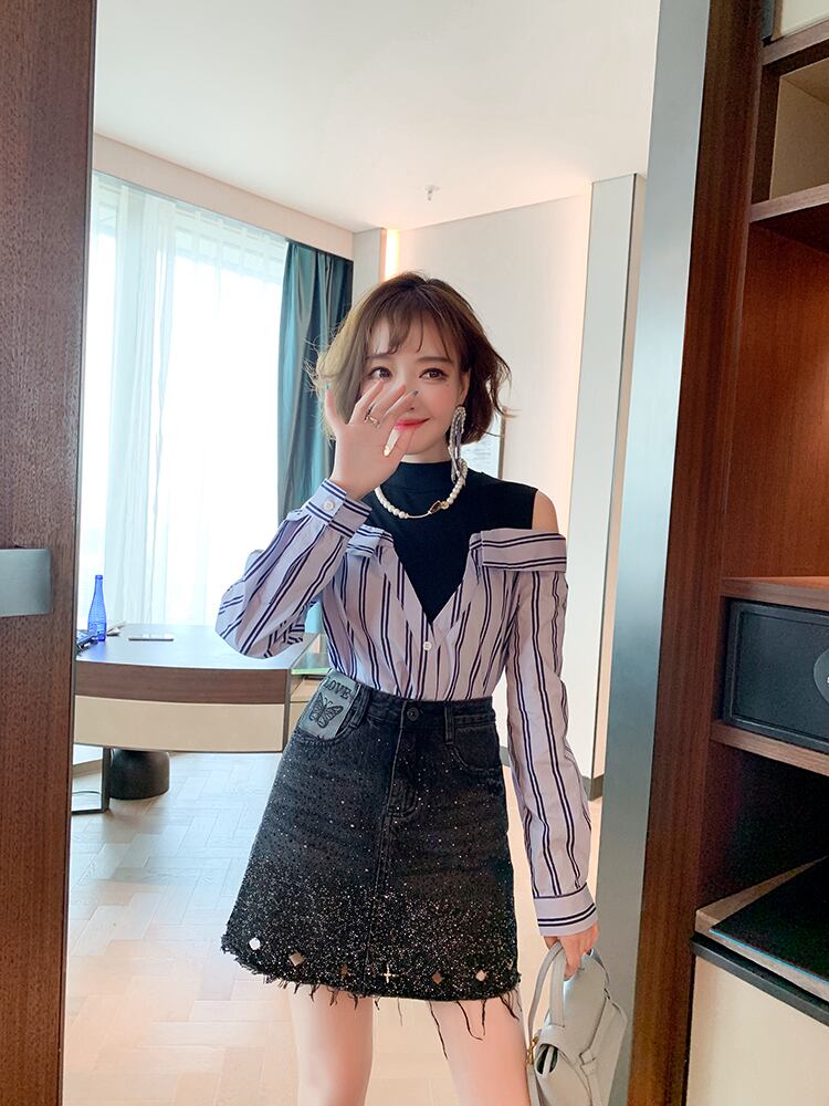 ブラックのインナーとストライプの長袖シャツのセットになっています♪