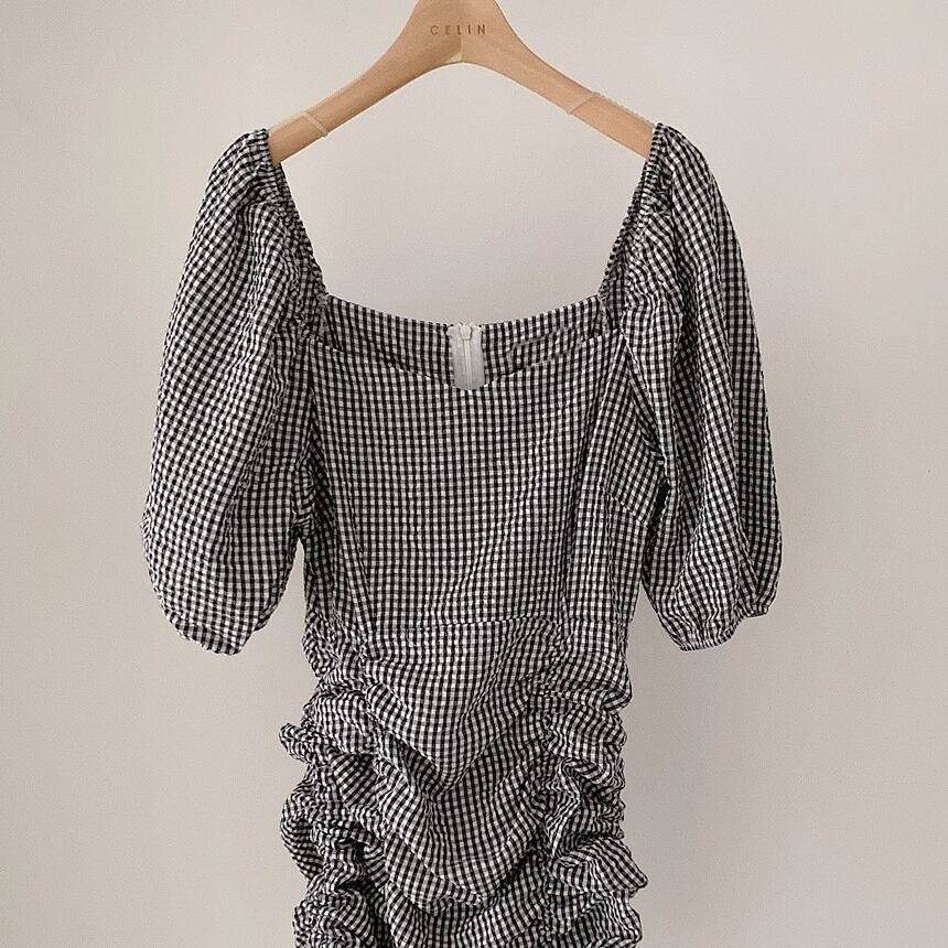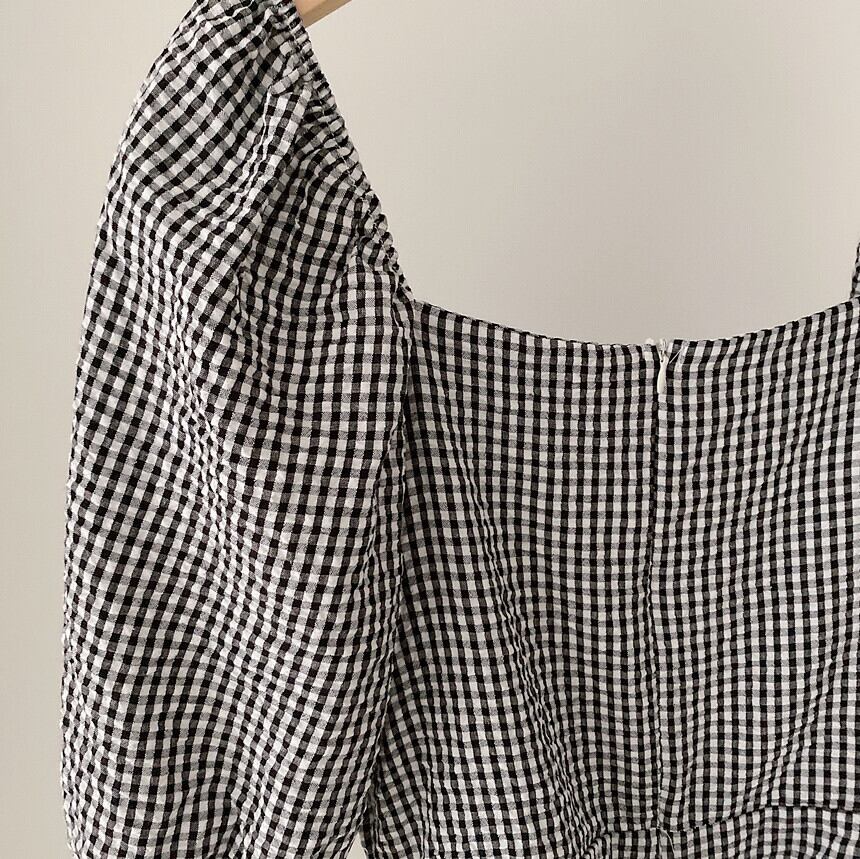 スクエアネックのパフスリーブのチェックのワンピース