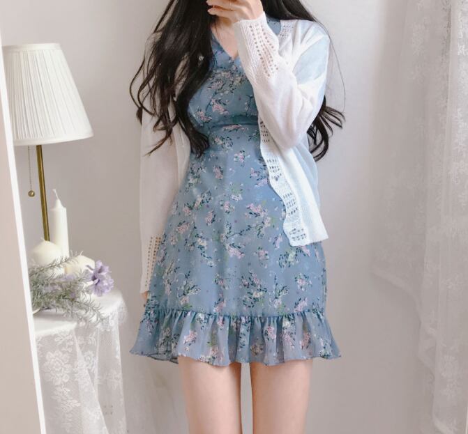 シフォンの小花のVネックのスッキリウェストラインのワンピース
