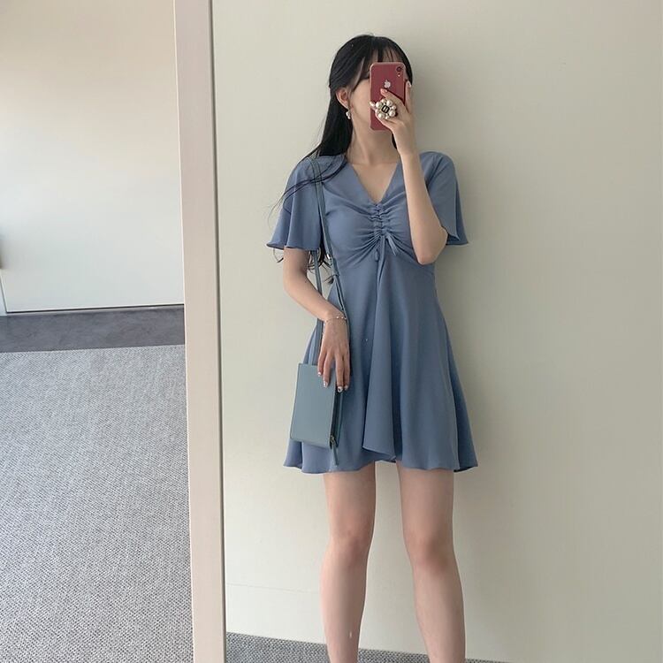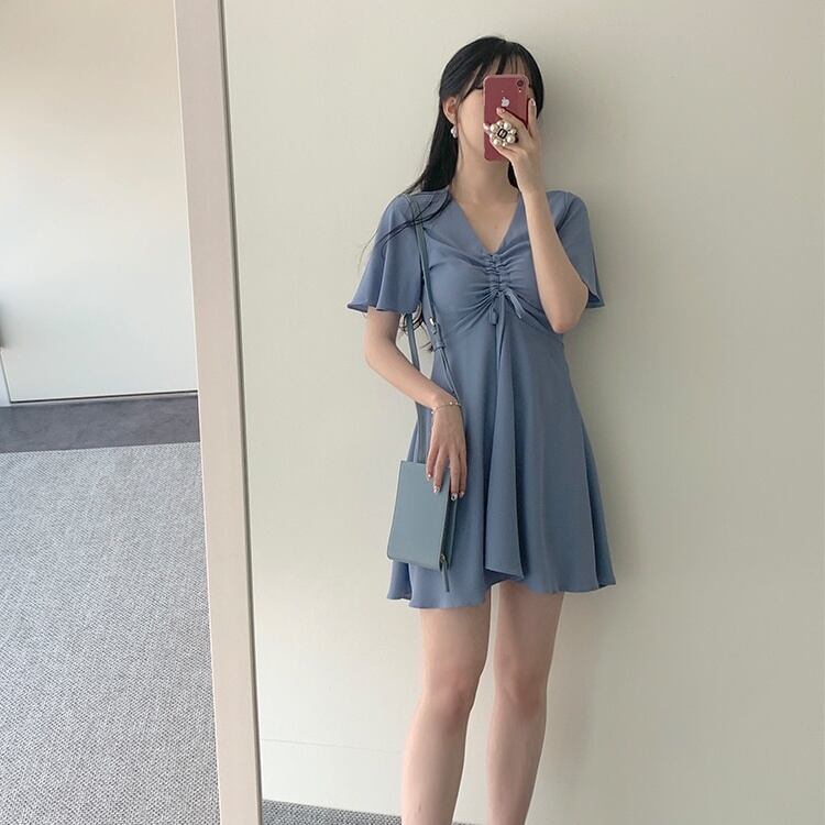 胸元の絞りがキュートな、ショート丈ワンピースです♪