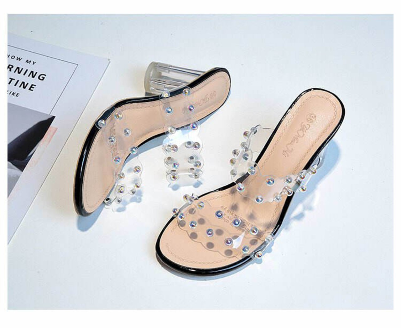 安定感のあるチャンキーヒールにクリアデザインで美脚効果もあり、キラキラのパールが上品でおしゃれな大人可愛いクリアサンダル。カジュアルにもパーティーにも◎