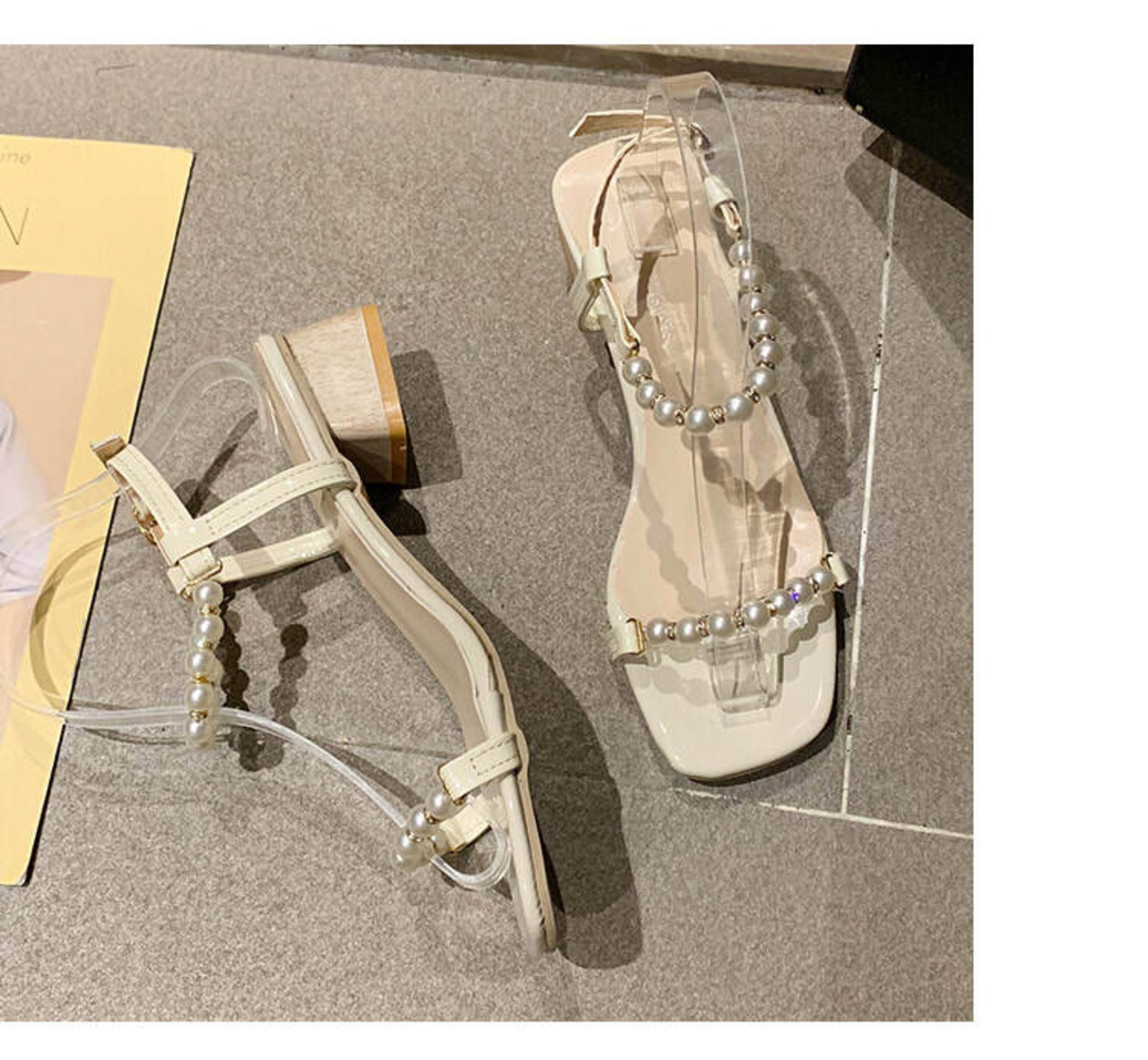 チャンキーヒールで安定感があり歩きやすく、パールのストラップが上品でゴージャスな大人可愛い、シンプルなサンダル。カジュアルにもパーティーなどにも◎