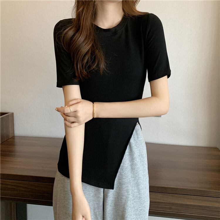 (3色選択可) レディース トップス Tシャツ カットソー ニットTシャツ ショート ショート丈 半袖 ラウンドネック スリム 細身 ニット サマーニット スリット かわいい 大人可愛い きれいめ シンプル カジュアル 大人 上品 おしゃれ お洒落 かっこいい 大人可愛い 大人女子 こなれ感 ラフ 無地 春 夏 秋 10代 20代 30代 40代 50代 レディース オフィス ビジネス OL 通勤 デート お出かけ 女子会 パーティー 普段使い 黒 ブラック 白 ホワイト 灰色 グレー | Chère
