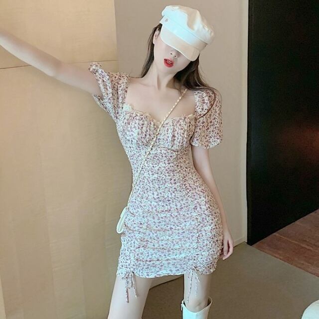 (サイズが選択可) ワンピース ショート丈 パフスリーブ スクエアネック オフショルダー 細身 シャーリング 綿 かわいい 大人可愛い カジュアル おしゃれ お洒落 大人女子 こなれ感 ラフ ラブリー キュート ガーリー 主役級 存在感 小花柄 春 夏 秋 10代 20代 30代 デート お出かけ お泊まり リゾート 旅行 海 プール ガーデン レストラン モテ 美脚 脚長 流行 インスタ映え S M L XL ホワイト | Chère