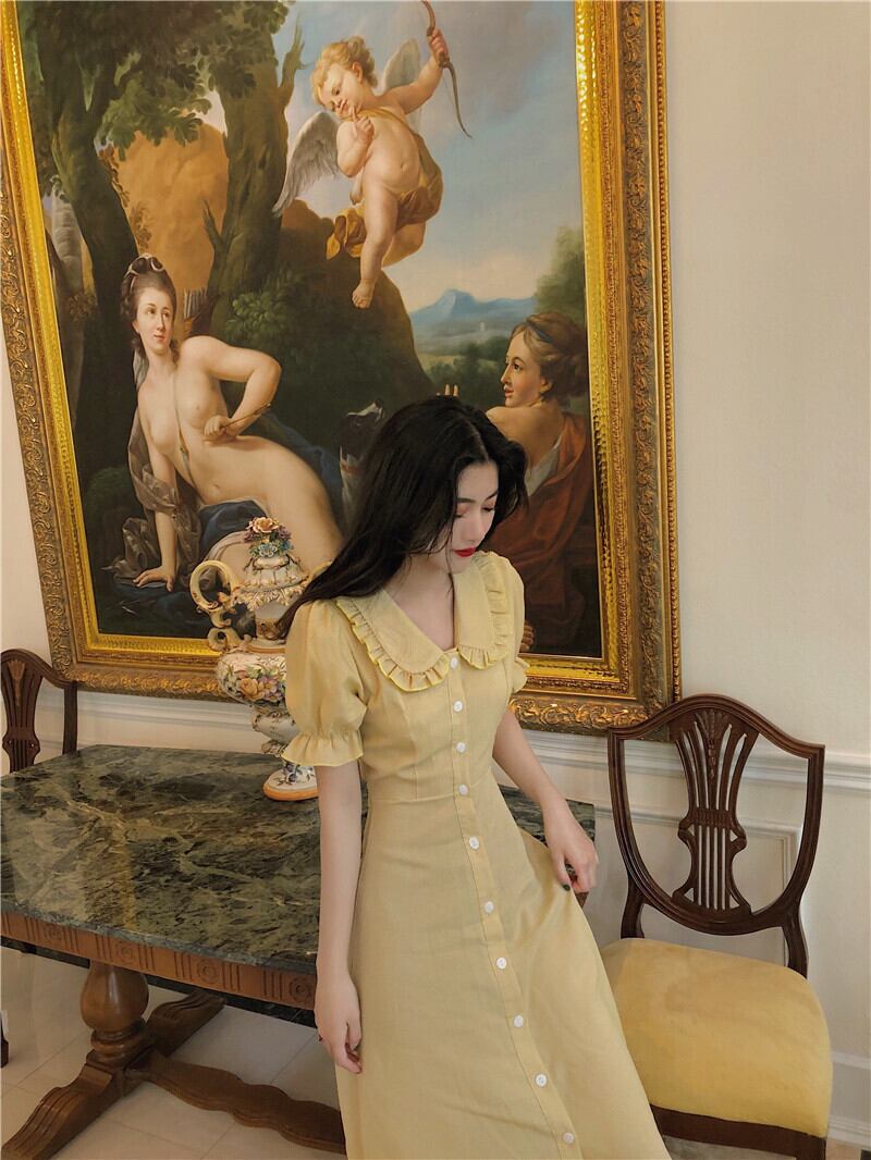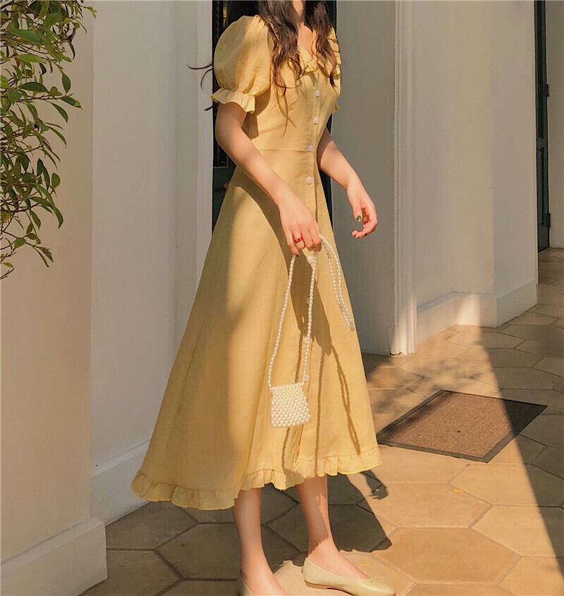 (色とサイズが選択可) ミモレ丈 半袖 パフスリーブ 襟付き Aライン フリル ウエストリボン 綿 かわいい 大人可愛い きれいめ 大人 上品 おしゃれ お洒落 大人女子 こなれ感 ラブリー キュート ガーリー エレガント 主役級 存在感 無地 春 夏 秋 10代 20代 30代 40代 オフィス ビジネス OL 女子会 リゾート 旅行 高原 ホテル ガーデン レストラン 韓国系 モテ トレンド 流行 インスタ映え S M L XL パープル イエロー | Chère