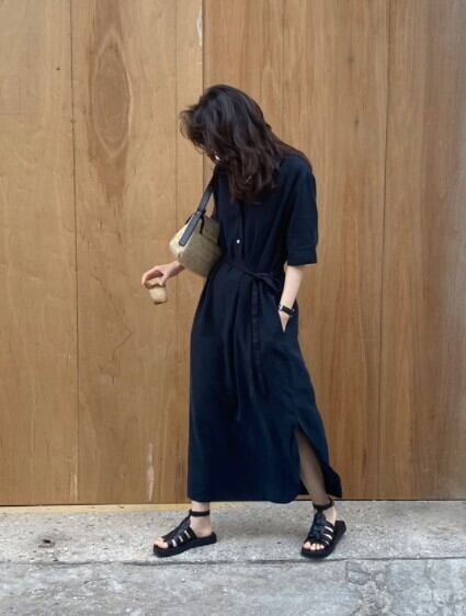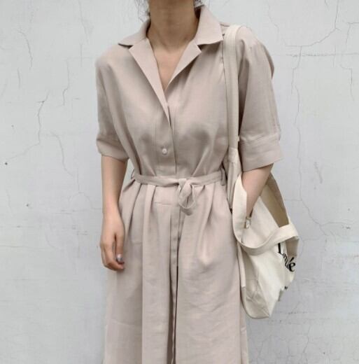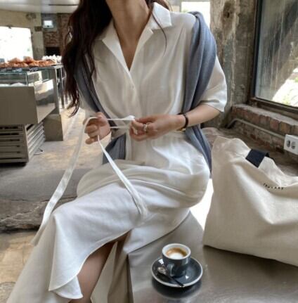 (4色選択可) ワンピース シャツワンピース ロング丈 5分袖 襟付き ストレート ウエストリボン サイドスリット 綿 大人可愛い きれいめ 大人 上品 おしゃれ お洒落 ルーズ 個性的 クール モード系 セクシー 無地 春 夏 秋 10代 20代 30代 40代 50代 オフィス OL 通勤 お泊まり 休日 リゾート 旅行 海 ガーデン レストラン 着回し 楽ちん 流行 インスタ映え ホワイト 水色 ネイビー アプリコット | Chère