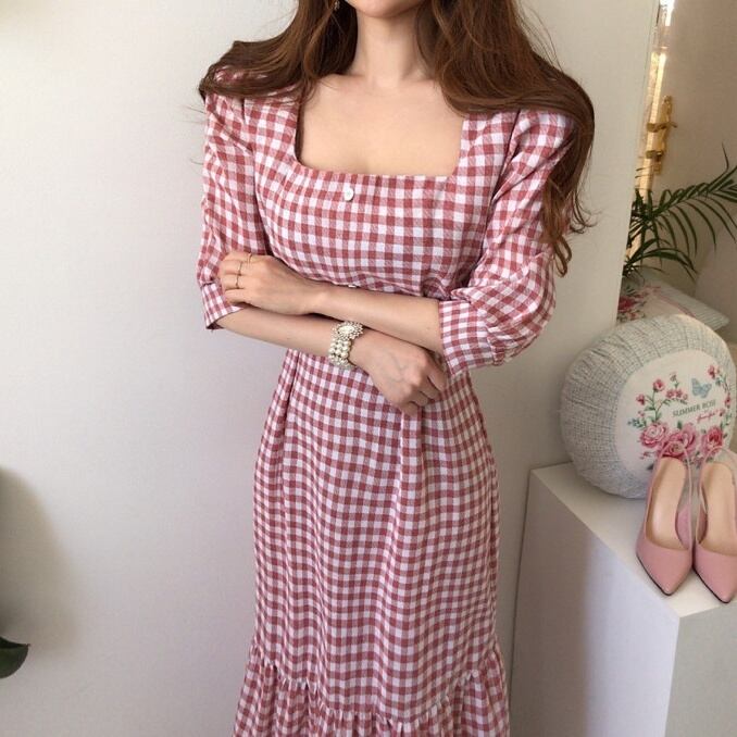 (色とサイズが選択可) ワンピース ロング丈 7分袖 スクエアネック Aライン フリル バックリボン 綿 かわいい 大人可愛い 上品 おしゃれ お洒落 大人女子 ラブリー キュート 主役級 存在感 チェック柄 春 夏 秋 10代 20代 30代 オフィス ビジネス リゾート 旅行 海 プール 高原 ホテル ガーデン レストラン 流行 インスタ映え S M L レッド ブルー | Chère