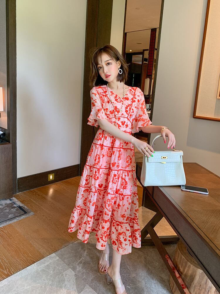 (サイズが選択可) レディース ワンピース ロングワンピース ロング丈 ミモレ丈 Vネック 半袖 フレアスリーブ フレアワンピース Aラインワンピース 花柄ワンピース 花柄 フラワー ウエストマーク ゆったり 涼し気 レディース 可愛い きれいめ シンプル カジュアル 大人 かわいい おしゃれ お洒落 上品 エレガント 大人可愛い 大人女子 春 夏 10代 20代 30代 40代 デート お出かけ 女子会 デイリー 普段着 パーティー リゾート レッド 赤