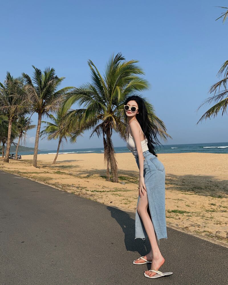 ダメージカットがアクセントのサイドスリット入りでセクシーな大人可愛いロングデニムスカート。