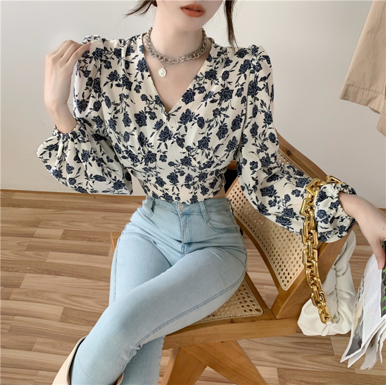 シンプルな花柄にVネックとカシュクールデザインで女性らしいメリハリのあるスタイルをつくる、大人可愛いショート丈シャツブラウス。