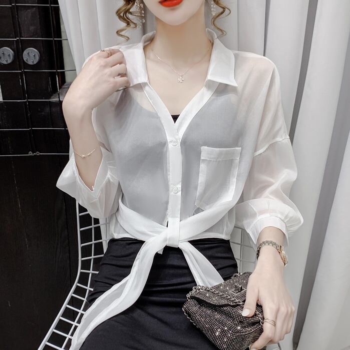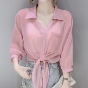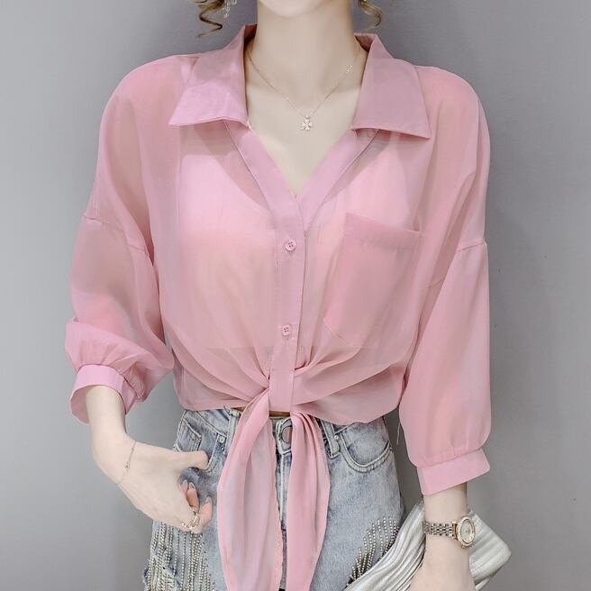(2色選択可) トップス シャツ 7分袖 襟付き シフォン シースルー ポリエステル かわいい 大人可愛い きれいめ 大人 上品 おしゃれ お洒落 かっこいい 大人女子 こなれ感 ラブリー キュート ガーリー セクシー エレガント 主役級 存在感 無地 春 夏 秋 10代 20代 30代 OL 通勤 学生 通学 デート お泊まり 休日 リゾート 旅行 海 プール 高原 ホテル ガーデン レストラン 着回し 重ね着 モテ 流行 インスタ映え ホワイト ピンク | Chère