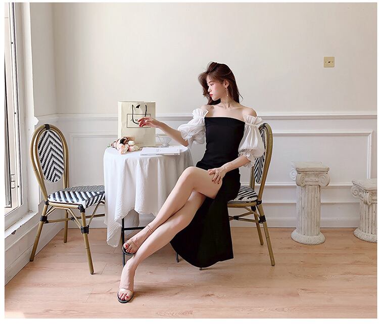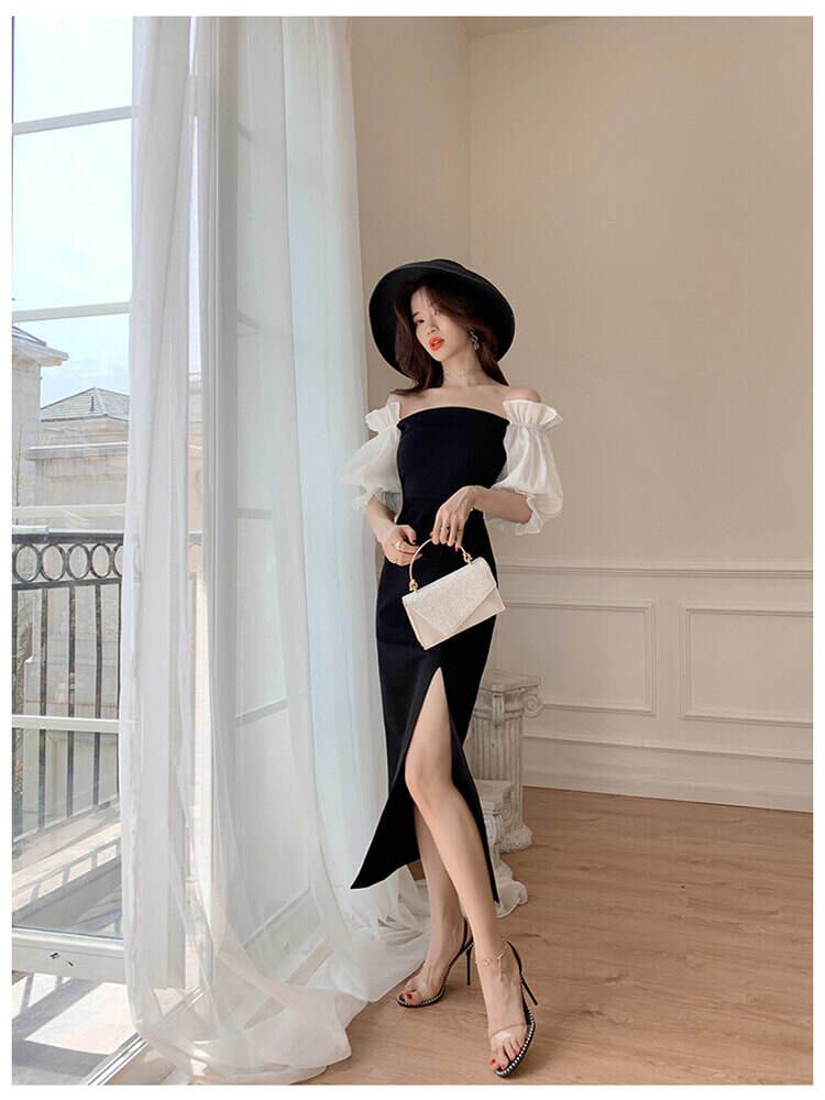 フリルのパフスリーブがアクセント、オフショルダーのタイトなシルエットにスリット入りで上品でセクシーな女性らしさを演出する、大人可愛いドレスワンピース。