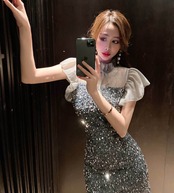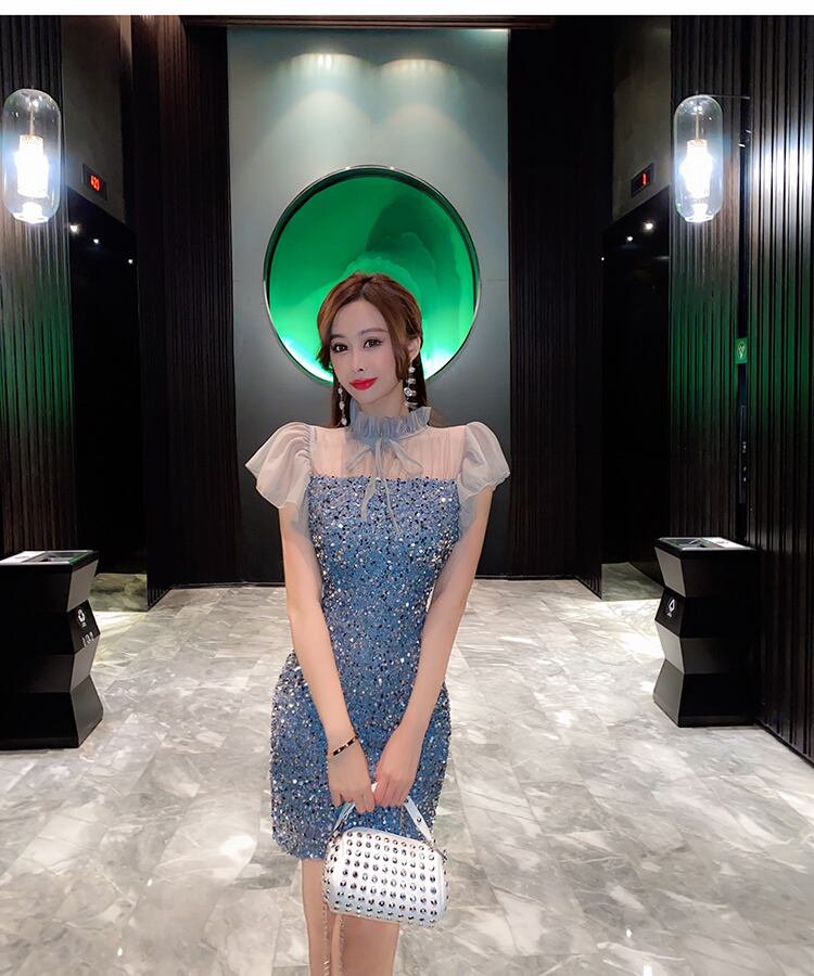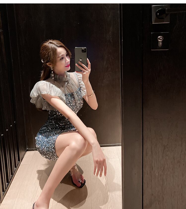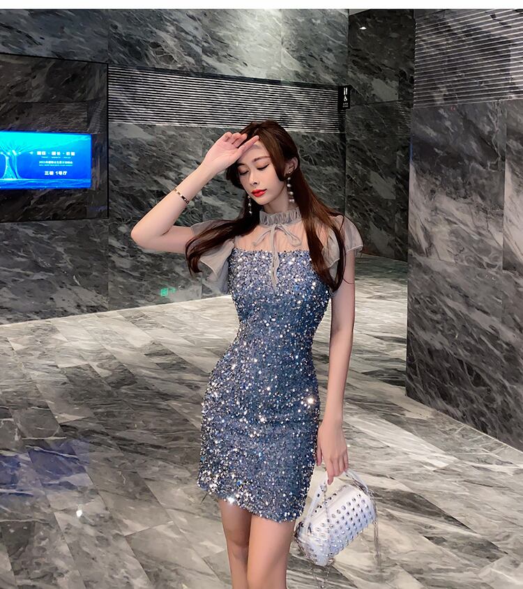 透け感のあるネック周りにフリル袖、全体にあしらわれたキラキラのスパンコールがエレガントな、大人可愛いドレスワンピース。