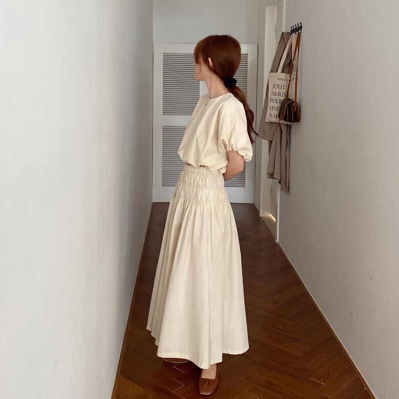 (3色選択可) セットアップ ブラウス ロングスカート フレアスカート マキシ丈 半袖 パフスリーブ ラウンドネック セミフレア シャーリング 上下セット かわいい 大人可愛い 大人 上品 おしゃれ お洒落 大人女子 こなれ感 ラブリー キュート エレガント モダン 主役級 存在感 無地 春 夏 秋 10代 20代 30代 OL 通勤 学生 デート お出かけ 休日 リゾート 旅行 海 高原 ホテル ガーデン レストラン 体系カバー トレンド 流行 インスタ映え ブルー アプリコット ブラック | Chère