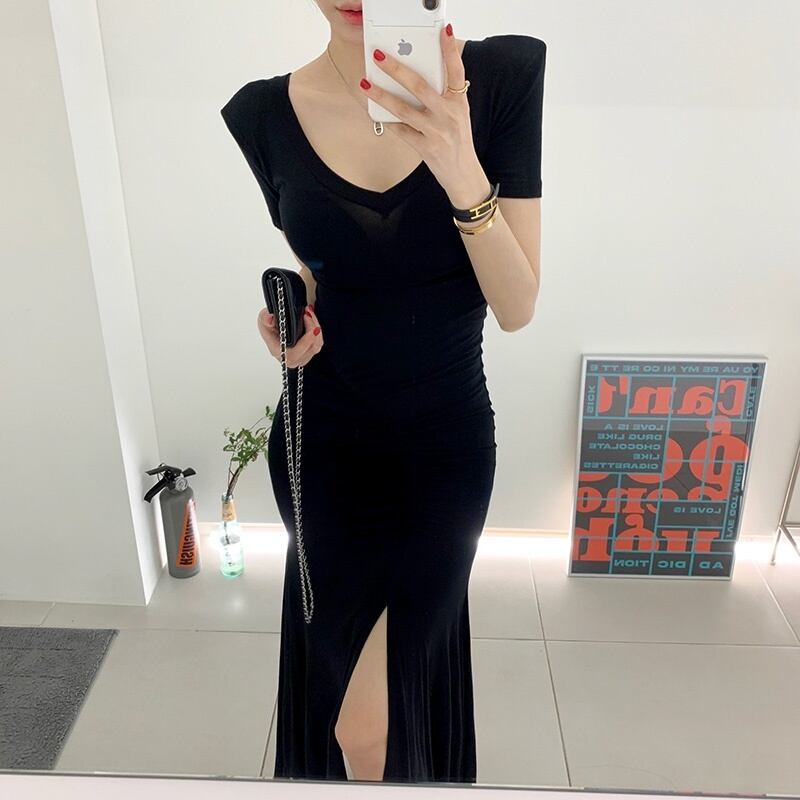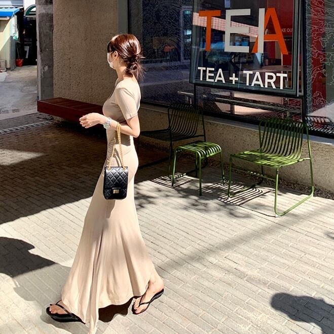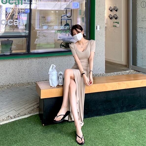 (2色選択可) レディース ワンピース ワンサイズ マキシ マキシ丈 9分丈 アンクル丈 袖あり 半袖 Vネック スリム タイト マーメイド 裾フレア プリーツ スリット きれいめ 大人 おしゃれ かっこいい 大人可愛い 大人女子 ラフ ルーズ 個性的 クール モード系 セクシー 黒 ブラック カーキ 無地 春 夏 10代 20代 女性用 OL 学生 デート お出かけ お泊まり イベント リゾート 旅行 韓国 韓国系 オルチャン ファッション コーデ 楽ちん モテ 美脚 インスタ映え | Chère