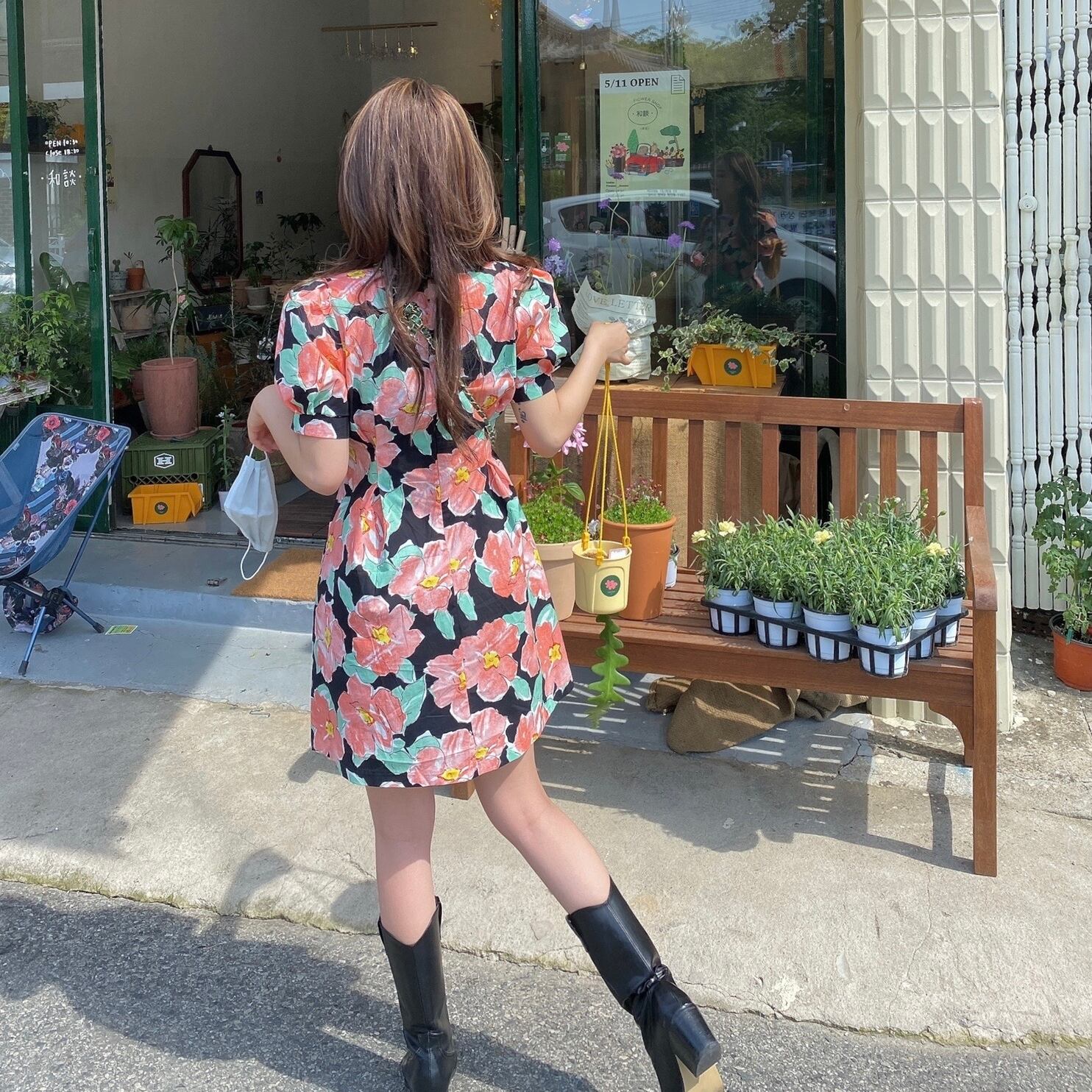 レトロな大柄のフラワープリントが着やせ効果抜群のワンピースです。