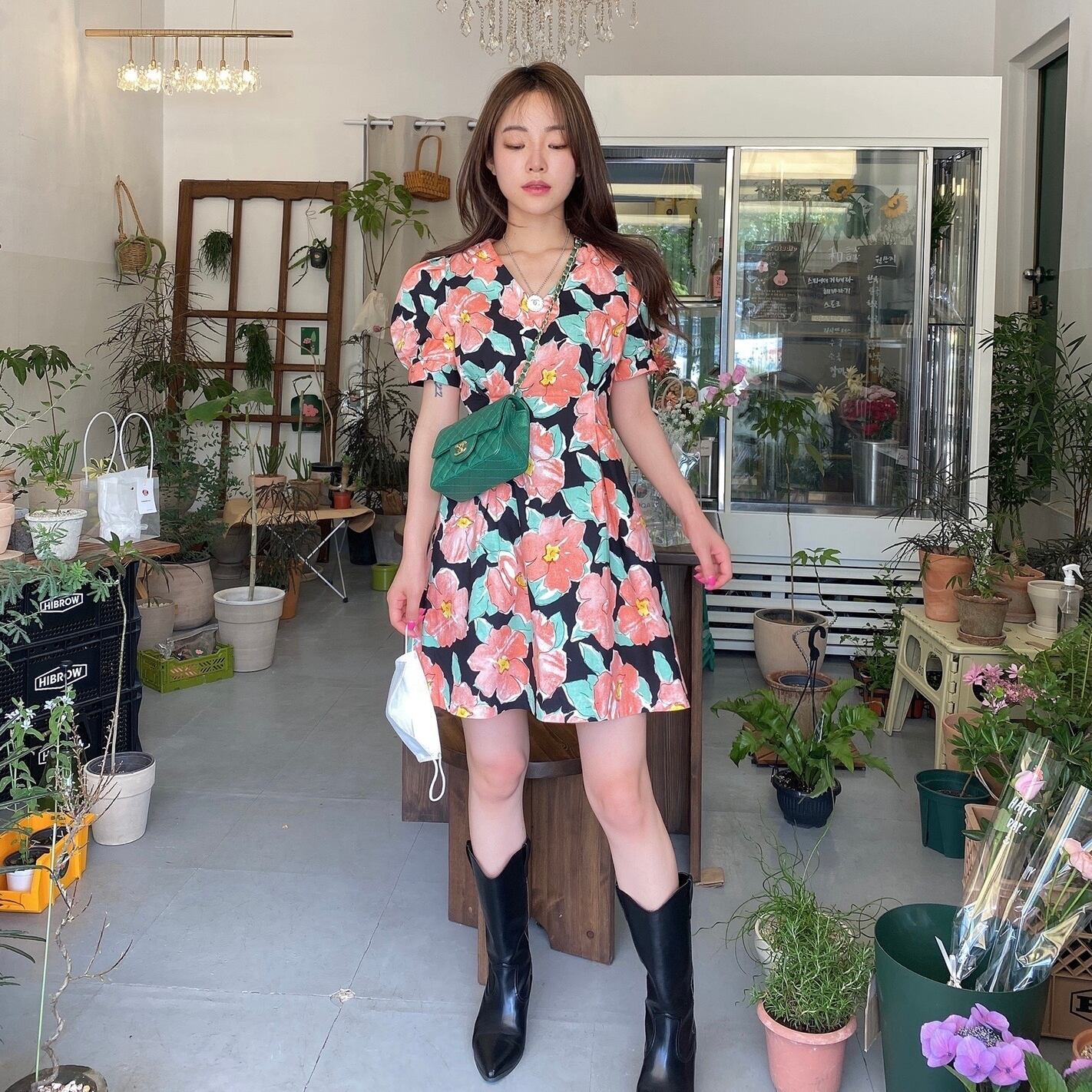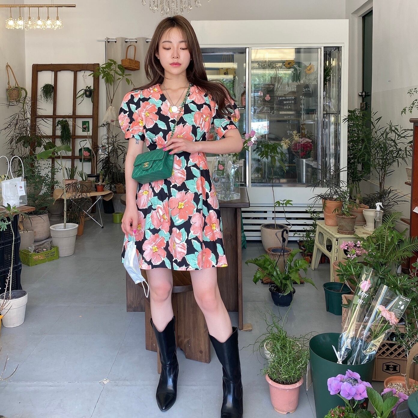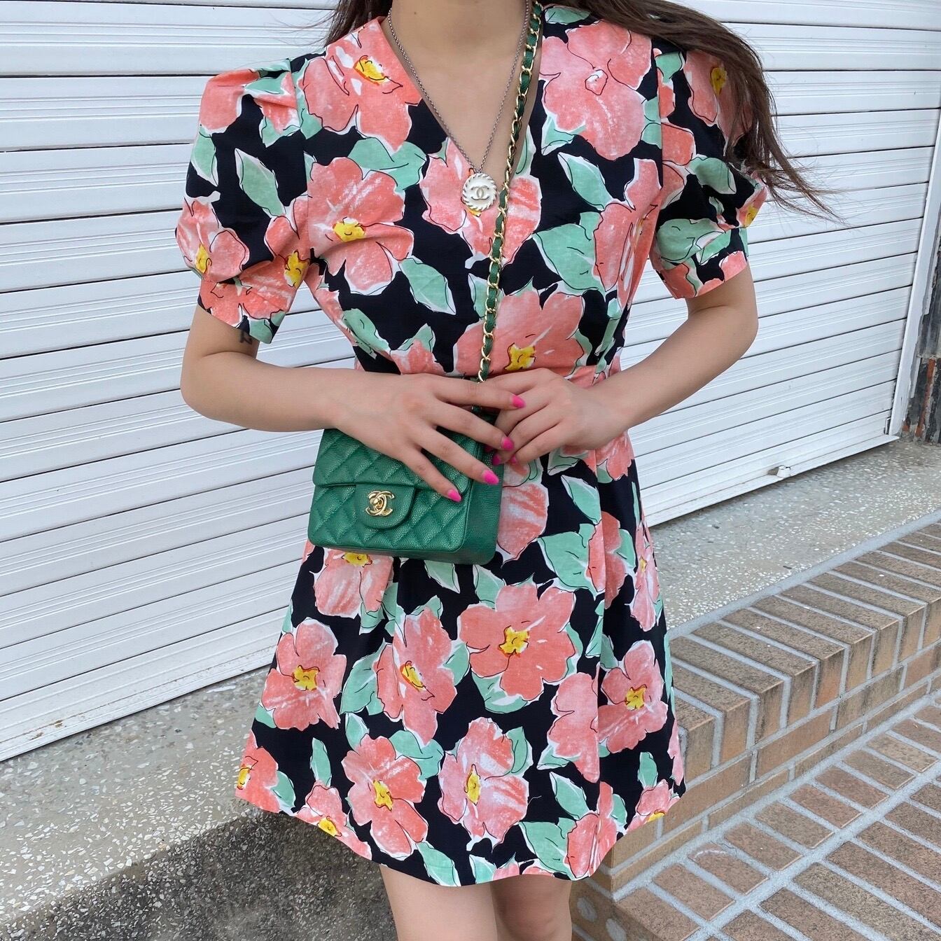 ワンピース バブル 半袖 スカートドレス 柄物 ワンピース Vネック 新スタイル タック入り フレア スタイリッシュ ミディアム ショート ミディ丈 ワイルド レトロ シンプル お洒落 大人可愛い フェミニン 春 夏 秋 デート 旅行 食事会 飲み会 二次会 結婚式 お泊り会 ハワイ 韓国 英語 アメリカ | Chère