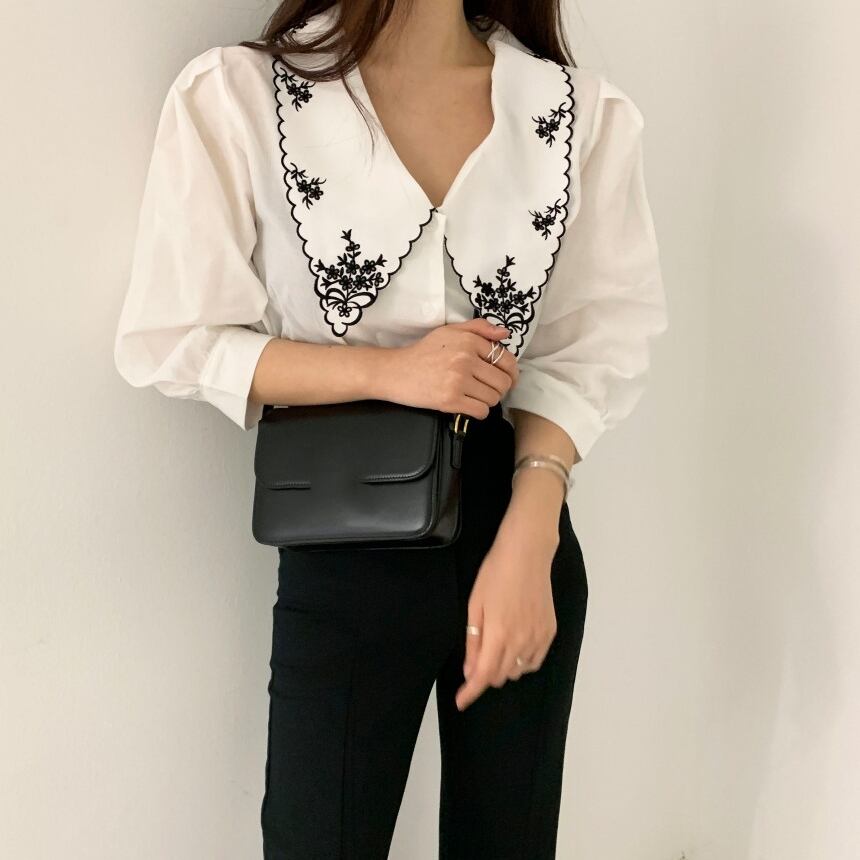 刺繍を施したビックカラーが小顔効果を叶える上品なブラウスです。