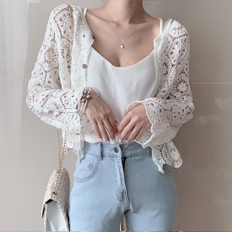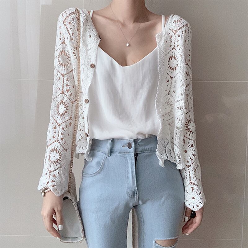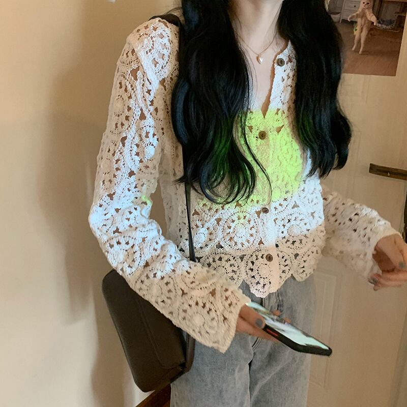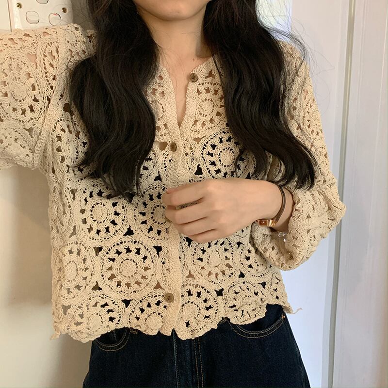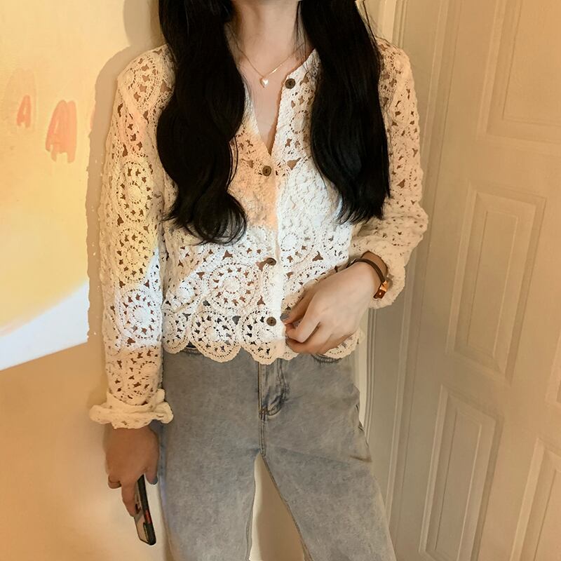 ショート丈で透け感が爽やかな印象のクロシェ編みカーディガンです。