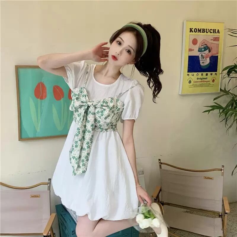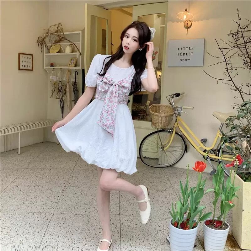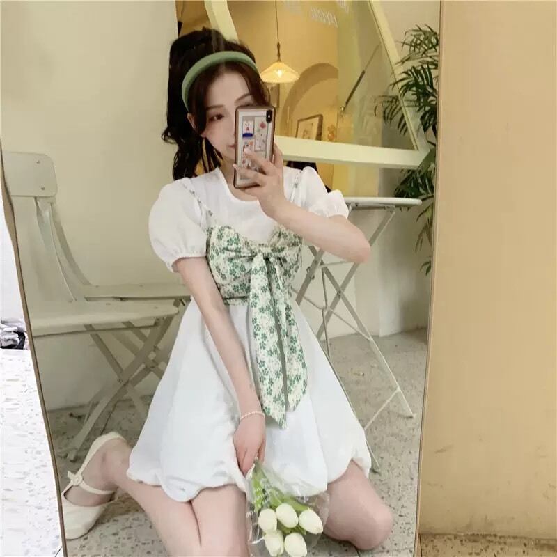 (3色選択可) レッド グリーン イエロー ホワイトカラー 半袖 ラウンドカラー 2個セット 韓版 Aラインスカート バブルスリーブ ドレス レディース サマーフレンチ 新しいデザイン 気質 リボン付き 盛り袖 カジュアル シンプル 清楚 10代 20代 30代 40代 女子高生 春 夏 秋 フェミニン お洒落 ゆめかわいい 可愛い 学生スタイル 飲み会 BBQ 二次会 結婚式 デート 旅行 | Chère