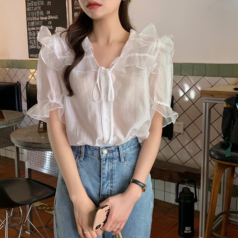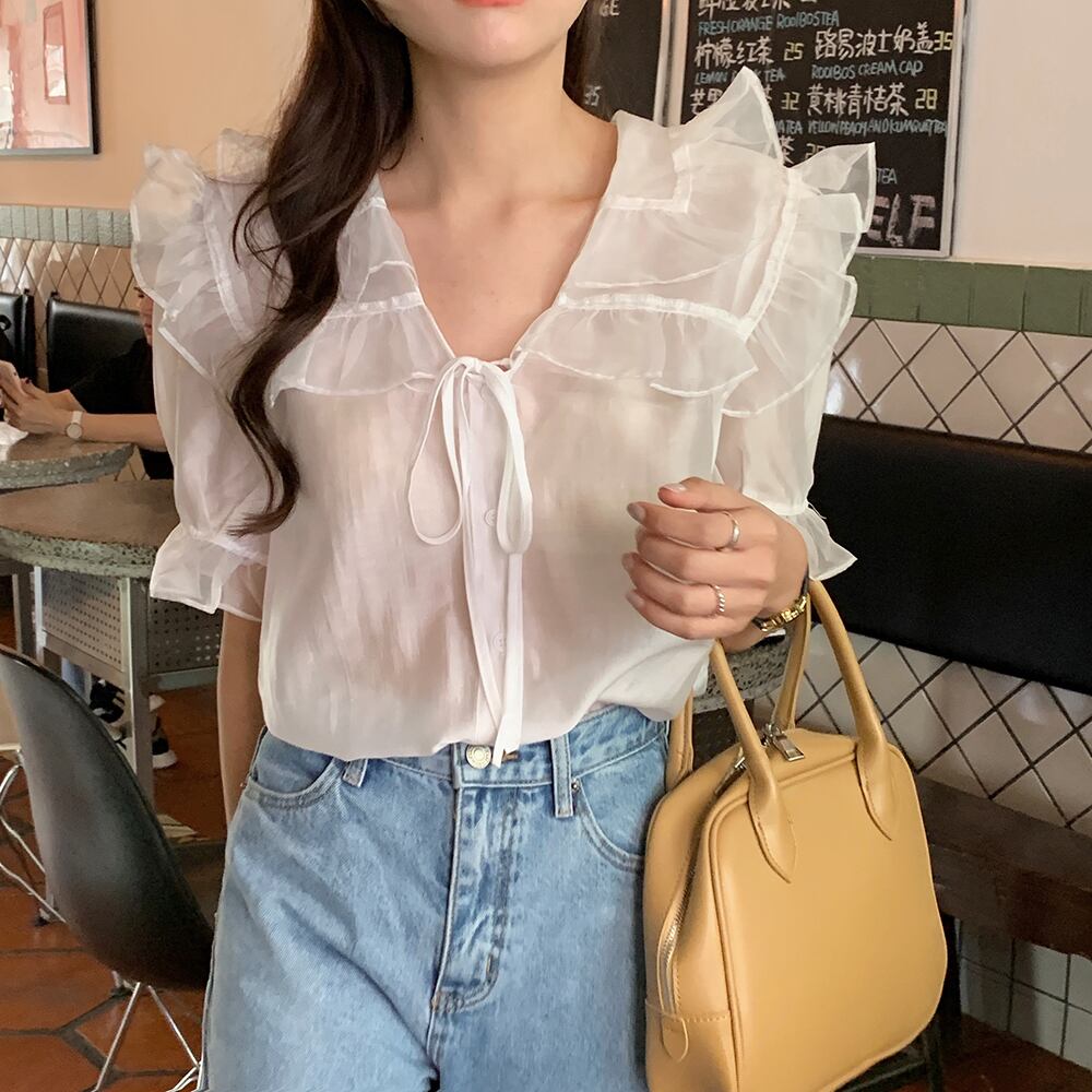 (色選択可) トップス ブラウス 5分袖 萌袖 Vネック 襟付き シフォン フリル リボン かわいい 大人可愛い きれいめ 大人 上品 おしゃれ お洒落 ラブリー キュート ガーリー エレガント 主役級 存在感 無地 春 夏 秋 10代 20代 30代 40代 OL 通勤 学生 通学 デート お出かけ お泊まり リゾート 旅行 海 高原 ホテル ガーデン レストラン 韓国系 オルチャン コーデ モテ プレゼント ギフト トレンド 流行 インスタ映え ホワイト ブラック | Chère
