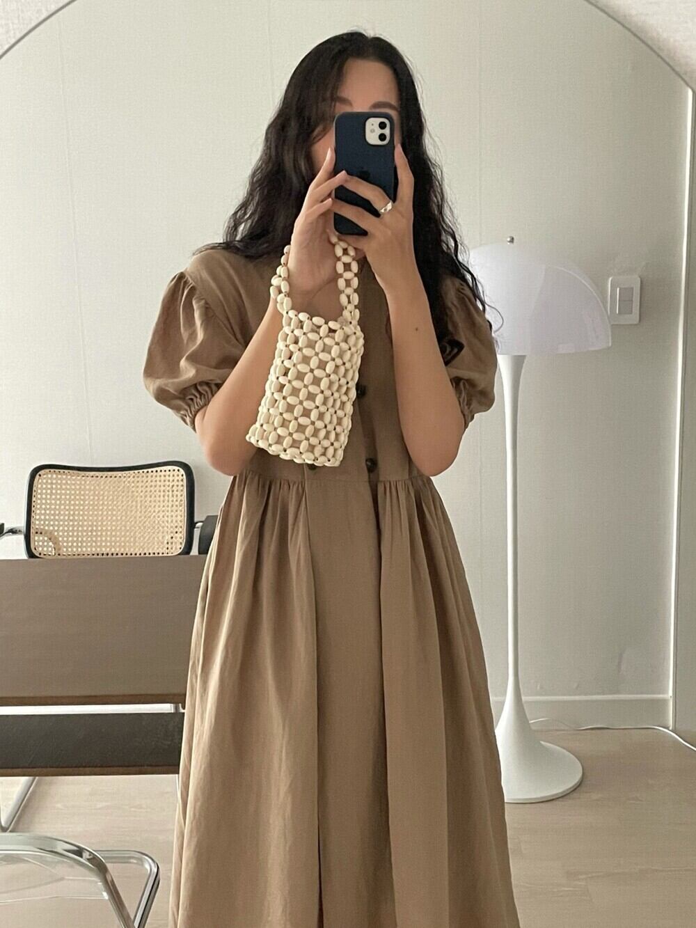 ワンピース ミモレ丈 5分袖 パフスリーブ Vネック 襟なし ギャザー 前開き 綿 かわいい 大人可愛い 大人 上品 おしゃれ お洒落 大人女子 こなれ感 ラブリー キュート 個性的 エレガント 主役級 存在感 無地 10代 20代 30代 40代 OL 通勤 学生 通学 デート お出かけ 休日 リゾート 旅行 海 プール 高原 ガーデン 韓国系 オルチャン 楽ちん モテ 定番 トレンド 流行 インスタ映え カーキ | Chère