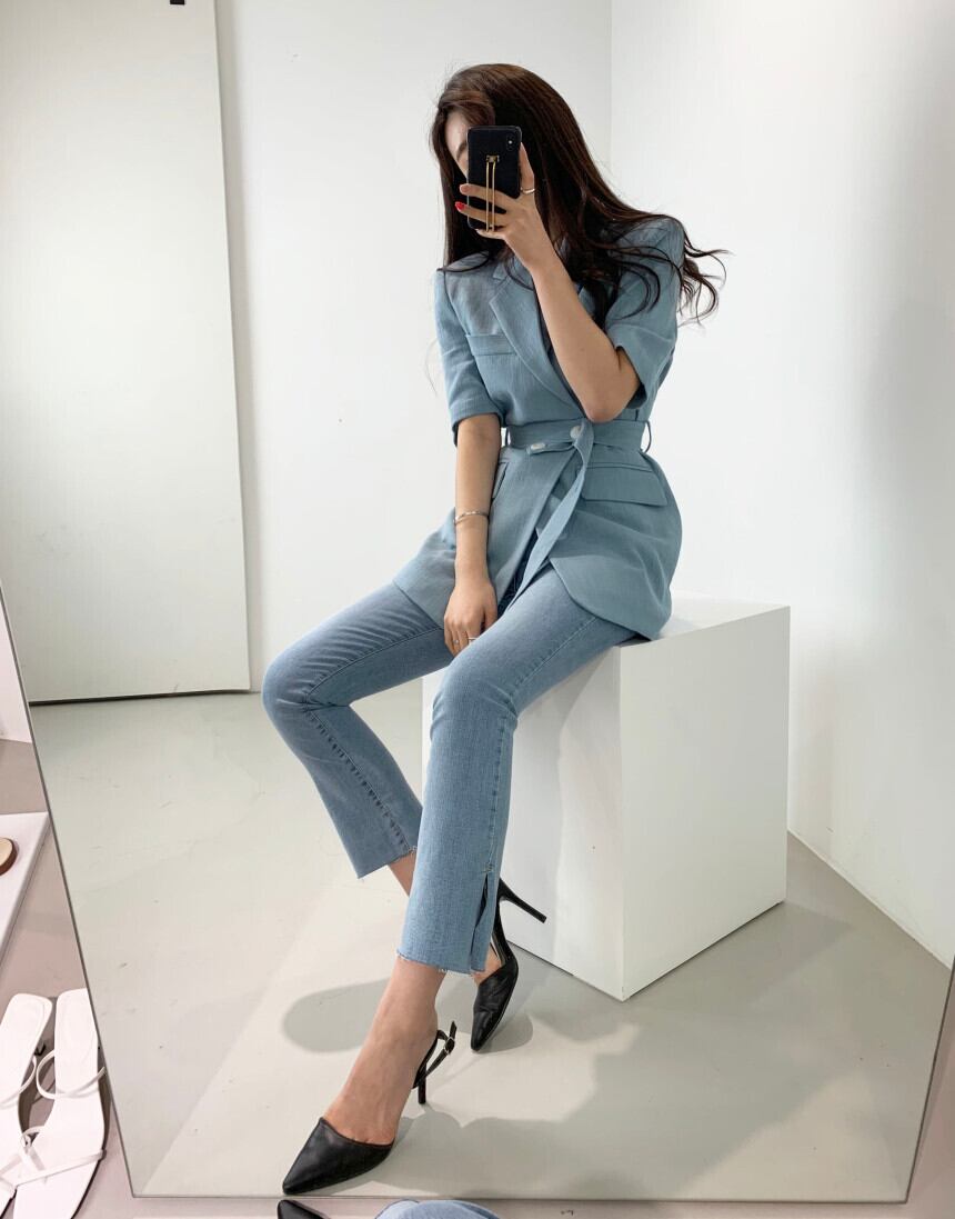 (3色選択可) ジャケット 半袖 Vネック 襟付き ベルト 大人可愛い 大人 おしゃれ お洒落 かっこいい 大人女子 こなれ感 マニッシュ 個性的 クール モード系 セクシー モダン 主役級 存在感 無地 春 夏 秋 20代 30代 40代 OL 通勤 デート お出かけ 休日 リゾート 旅行 高原 ホテル ガーデン レストラン 普段使い 韓国系 オルチャン コーデ スタイル モテ 美脚 脚長 定番 トレンド 流行 インスタ映え ブルー カーキ | Chère