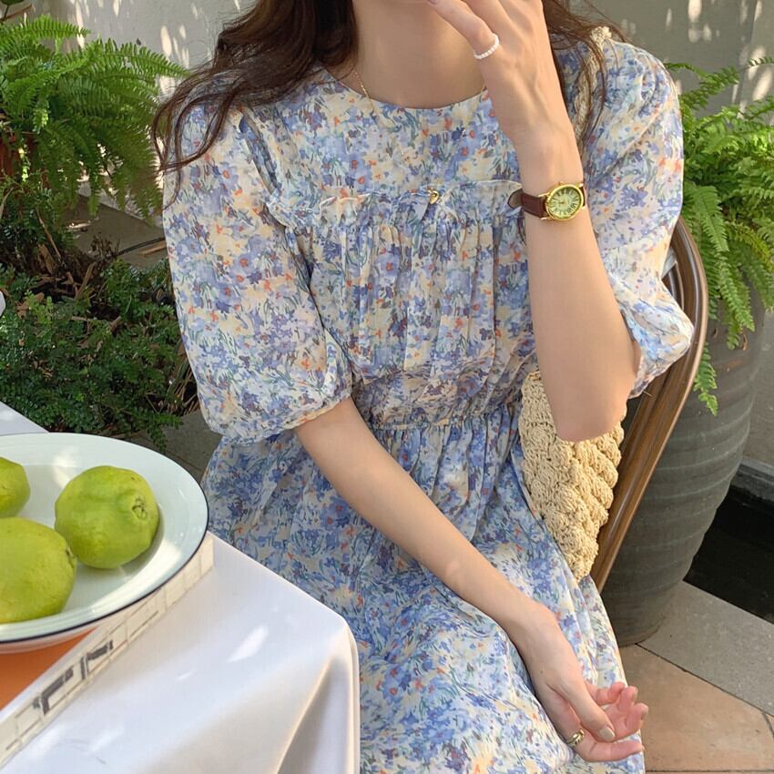 (2色選択可) ワンピース 5分袖 パフスリーブ ギャザー 綿 かわいい 大人可愛い きれいめ 大人 上品 おしゃれ お洒落 大人女子 こなれ感 ラブリー キュート ガーリー エレガント 主役級 存在感 小花柄 春 夏 秋 10代 20代 30代 40代 OL 通勤 学生 通学 デート お出かけ リゾート 旅行 高原 ホテル ガーデン レストラン 韓国系 スタイル 体系カバー 定番 流行 インスタ映え ブルー パープル