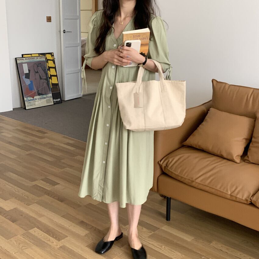 (3色選択可) レディース ワンピース シャツワンピース フレアワンピース ロングワンピース ロング丈 Vネック ノーカラー 半袖 5分袖 パフスリーブ リボン プリーツ ゆったり 体型カバー 前開き レディース 可愛い きれいめ シンプル カジュアル 大人 かわいい おしゃれ お洒落 上品 エレガント フェミニン 大人可愛い 大人女子 無地 春 夏 10代 20代 30代 40代 50代 デート お出かけ 女子会 デイリー 普段着 リゾート ベージュ グリーン 緑 ブルー 青 | Chère