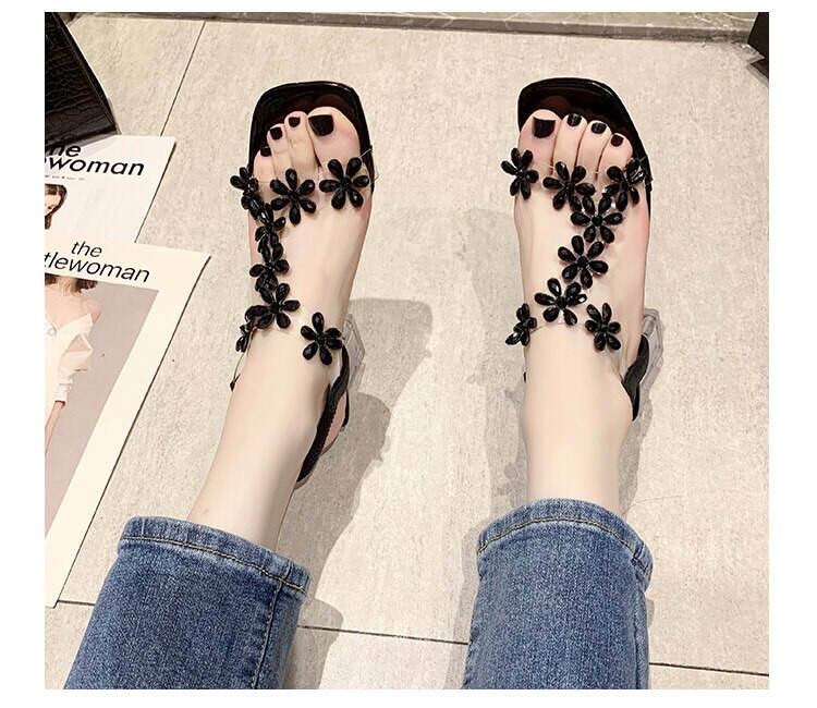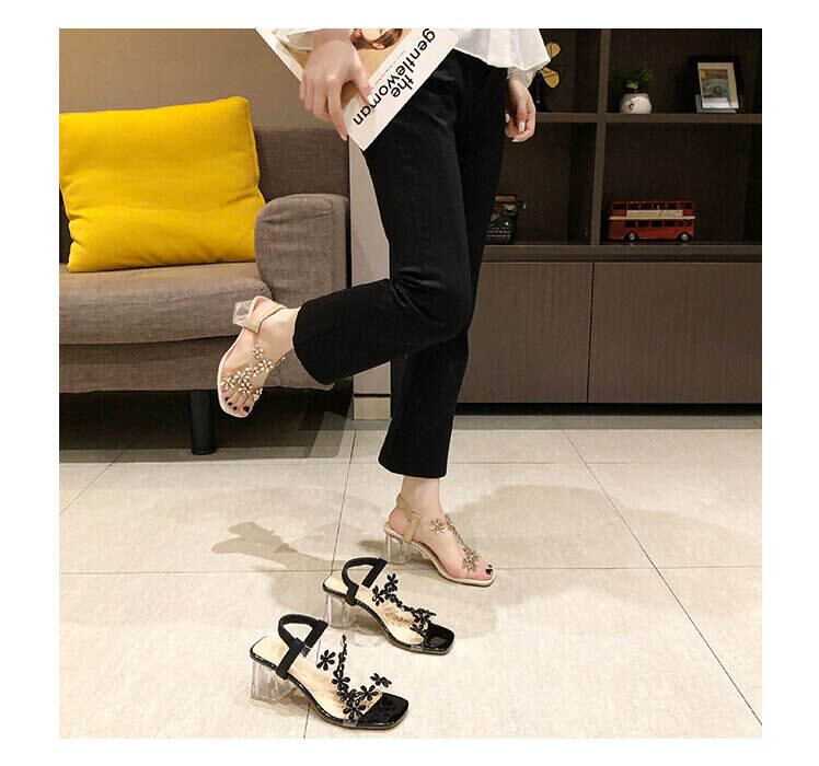 チャンキーヒールで安定感があり歩きやすく、花柄のラインストーンストラップがおしゃれで大人可愛いクリアサンダル。