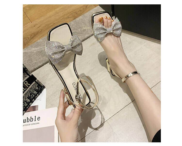 チャンキーヒールで安定感があり歩きやすく、キラキラのラインストーンのリボンがおしゃれで大人可愛いサンダル。