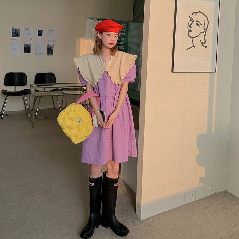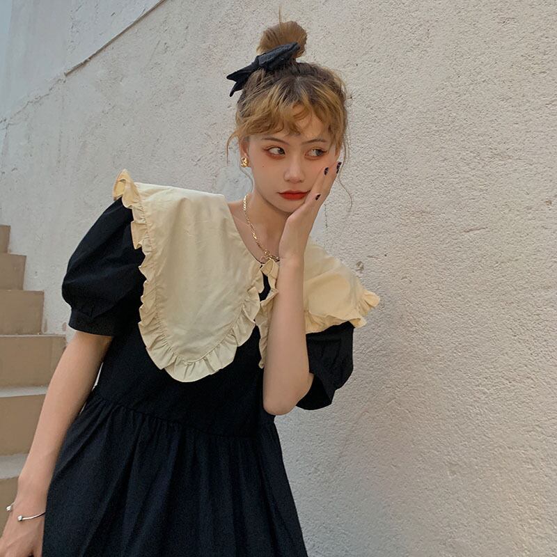 (3色選択可) ワンピース ワンピドレス ひざ丈 半袖 パフスリーブ Vネック 襟付き Aライン ポリエステル かわいい 大人可愛い お洒落 レトロ 大人女子 こなれ感 ラブリー キュート ガーリー 存在感 無地 春 夏 秋 10代 20代 学生 通学 デート お泊まり 休日 リゾート 旅行 韓国系 オルチャン 楽ちん 体系カバー 流行 インスタ映え ブラック ブルー パープル | Chère