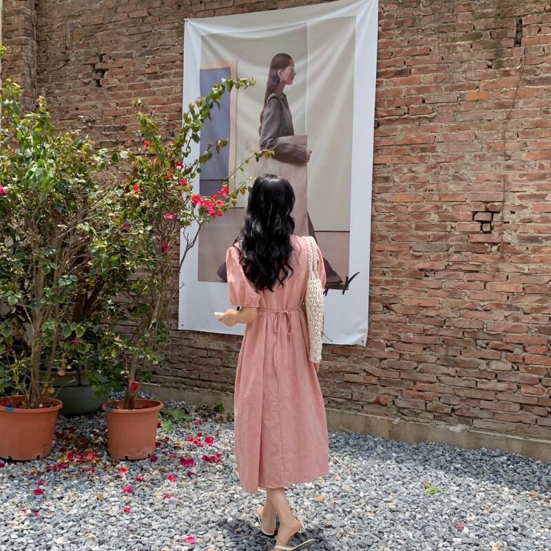 (4色選択可) ワンピース ミモレ丈ドレス パフスリーブ Vネック Aライン バックリボン ポリエステル かわいい 大人可愛い 大人 上品 おしゃれ お洒落 大人可愛い 大人女子 こなれ感 ラブリー キュート エレガント 無地 10代 20代 30代 通勤 学生 通学 お泊まり 休日 リゾート 旅行 高原 ガーデン 韓国系 体系カバー 二の腕カバー モテ 流行 インスタ映え 春 夏 秋 ホワイト ブルー ピンク アプリコット | Chère