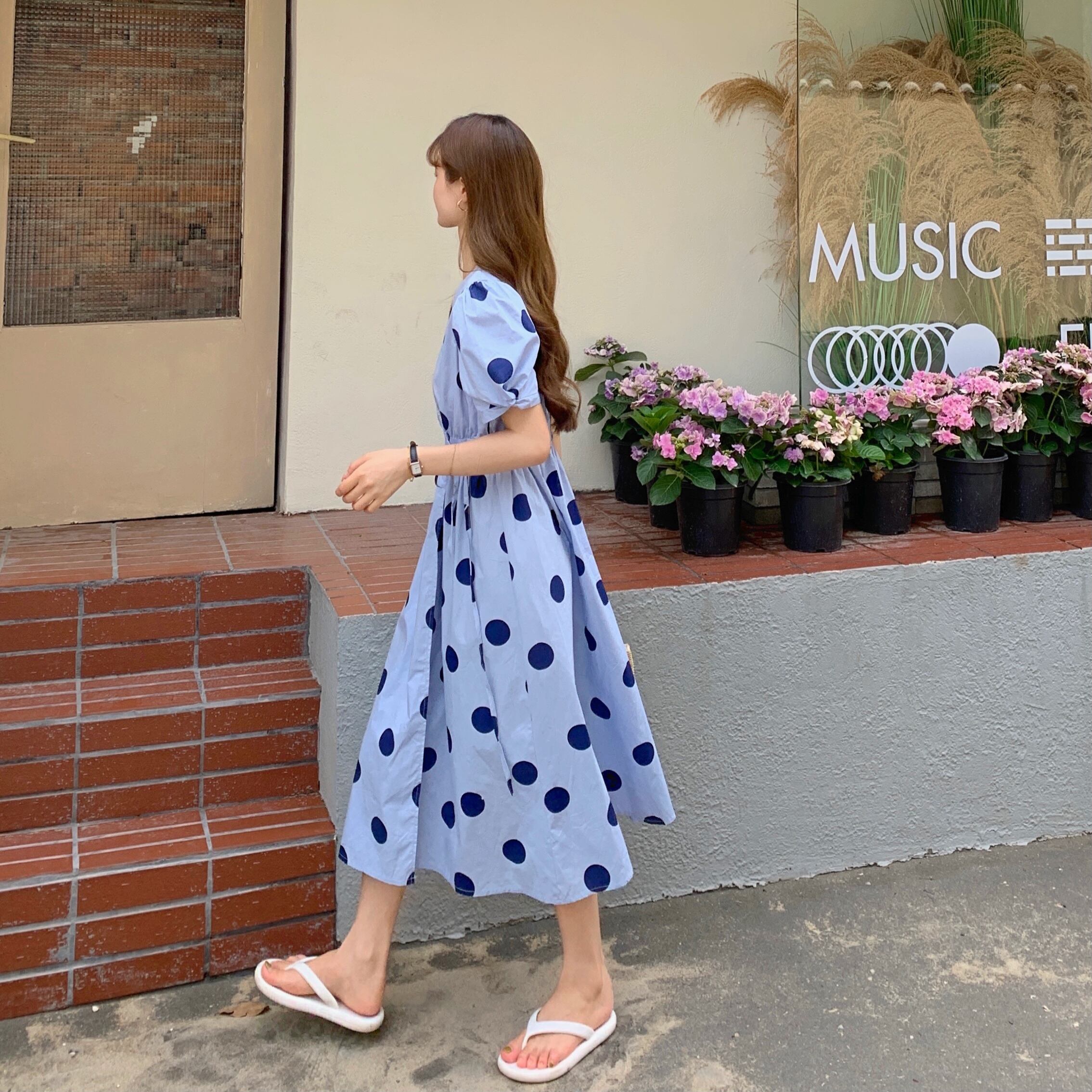 (3色選択可) ワンピース ロング丈 半袖 パフスリーブ Vネック セミフレア ウエストリボン ポリエステル かわいい 大人可愛い カジュアル おしゃれ お洒落 レトロ 大人可愛い 大人女子 ラブリー キュート 存在感 ドット柄 10代 20代 通勤 学生 通学 デート 休日 リゾート 旅行 海 プール 韓国系 体系カバー 美脚 インスタ映え 春 夏 ホワイト ブルー アプリコット | Chère