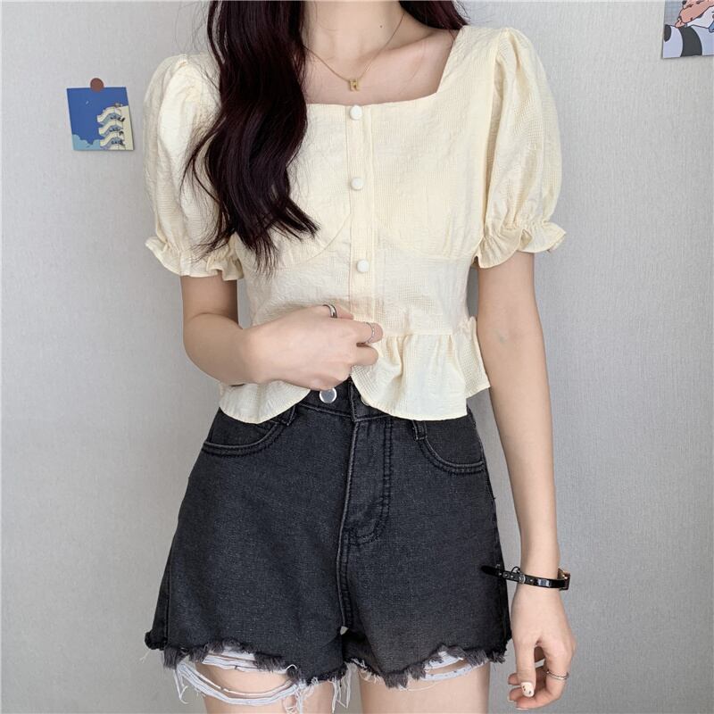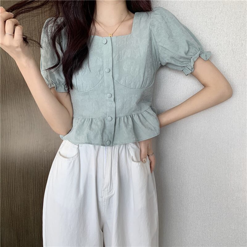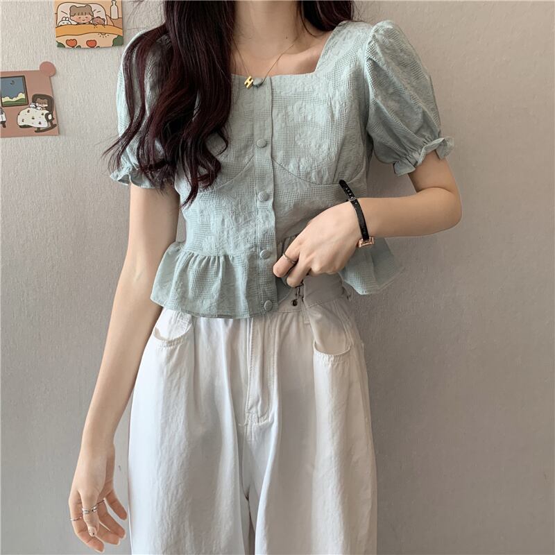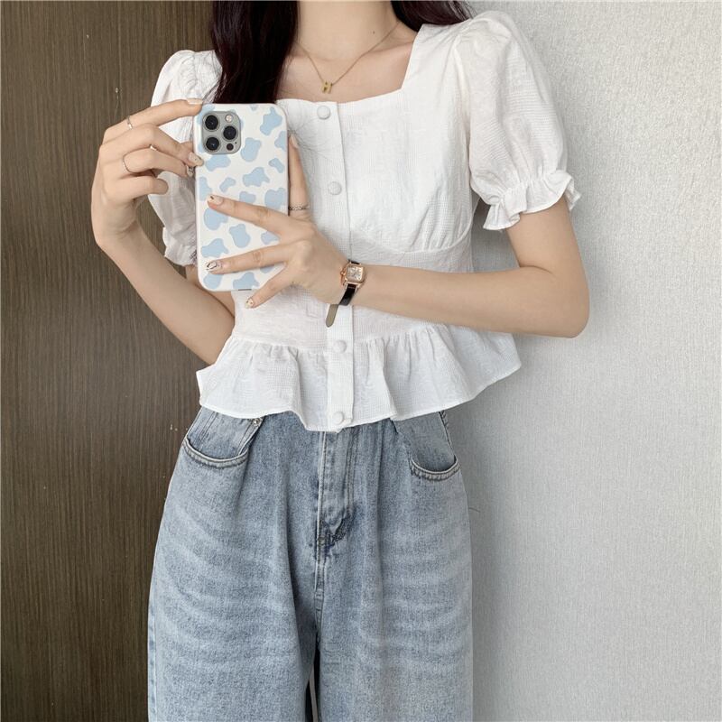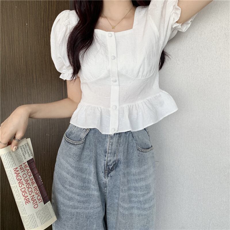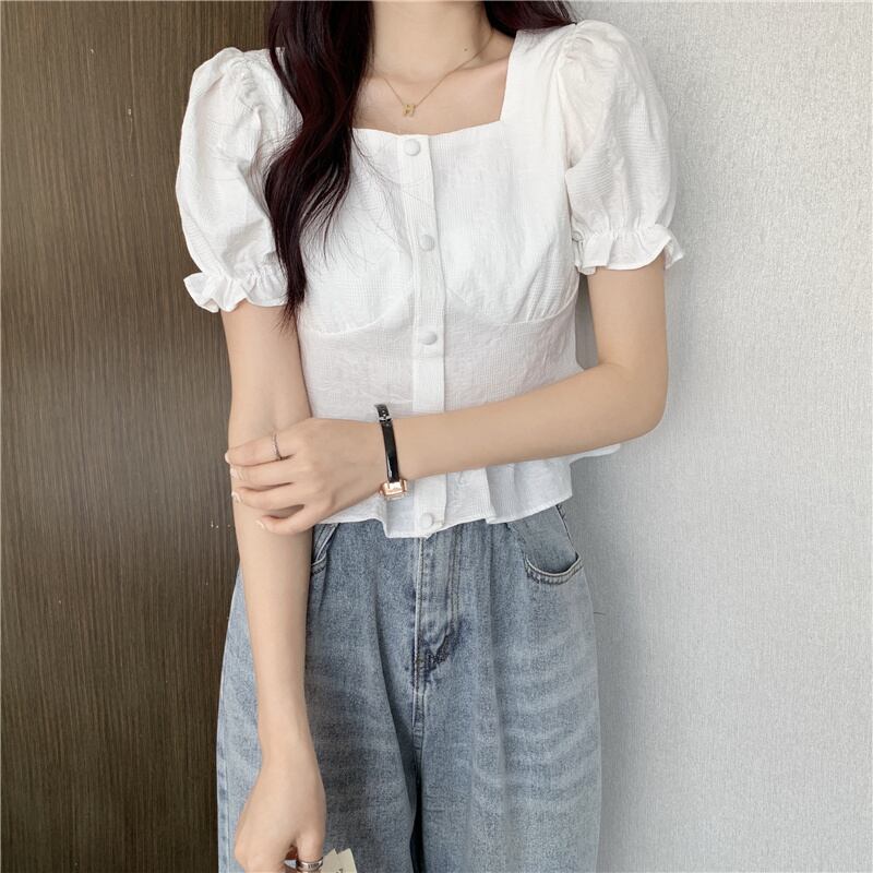 (3色選択可) トップス シャツ 半袖 パフスリーブ スクエアネック フリル 前開き ポリエステル かわいい 大人可愛い 大人 上品 おしゃれ お洒落 レトロ ラブリー キュート 無地 春 夏 10代 20代 通勤 学生 通学 デート お出かけ 休日 リゾート 旅行 海 プール 高原 ガーデン 着回し 韓国系 オルチャン インスタ映え ホワイト ブルー アプリコット | Chère