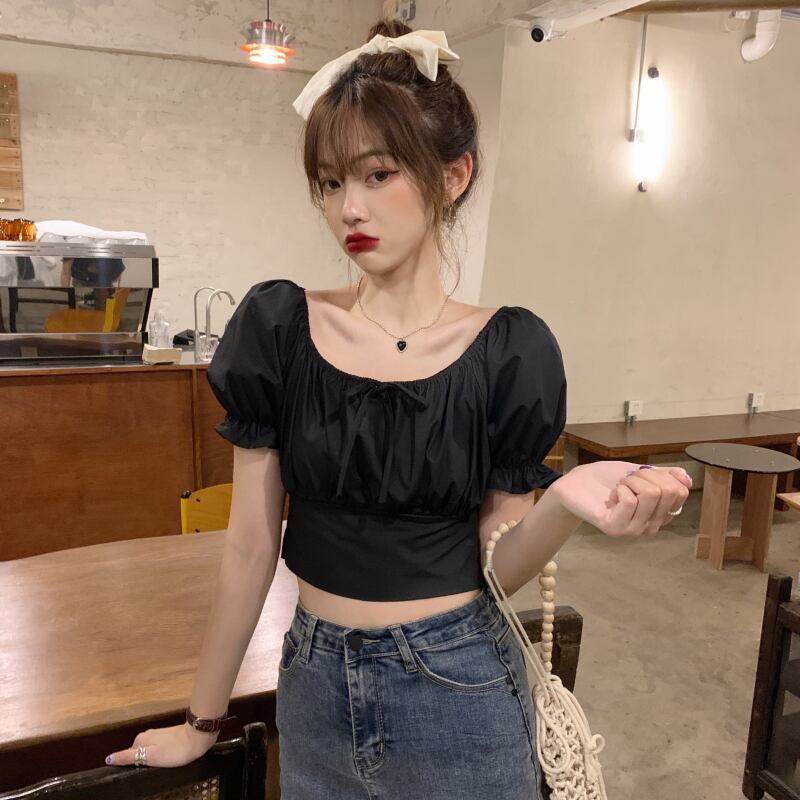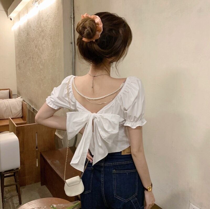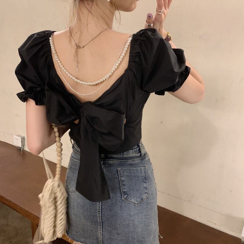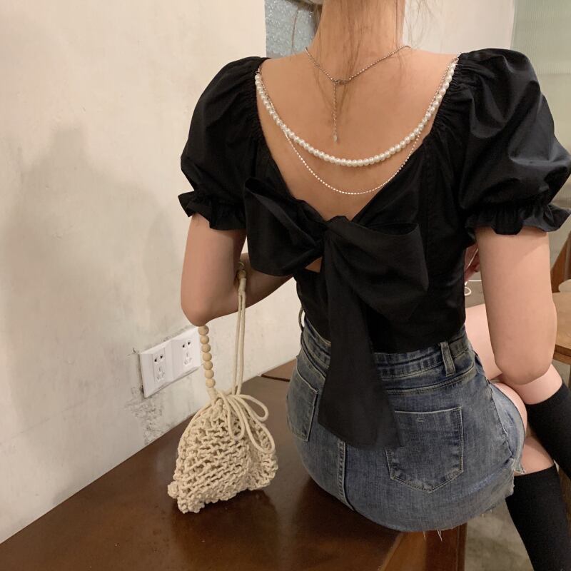 (2色選択可) トップス ブラウス 半袖 パフスリーブ ラウンドネック フリル バックリボン コットン かわいい 大人可愛い カジュアル おしゃれ お洒落 ラブリー キュート ガーリー 存在感 無地 春 夏 10代 20代 デート お出かけ お泊まり 高原 ガーデン レストラン 韓国系 コーデ モテ インスタ映え ホワイト ブラック | Chère