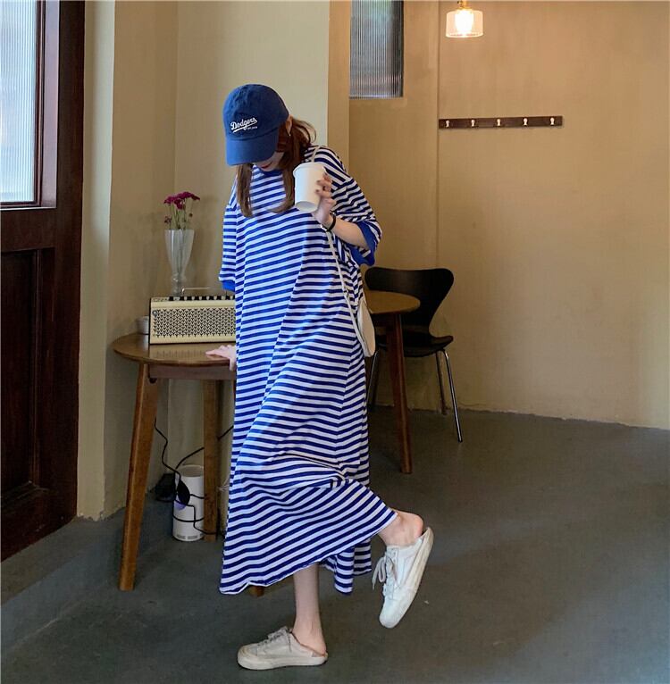 (色とサイズが選択可) ワンピース ロングドレス ロング丈 半袖 クルーネック Iライン コットン かわいい 大人可愛い カジュアル 大人 おしゃれ お洒落 かっこいい 大人女子 こなれ感 ラフ スポーティー キュート 主役級 存在感 ボーダー 10代 20代 30代 デート お出かけ 公園デビュー お泊まり 休日 リゾート 旅行 海 プール 体系カバー 二の腕カバー 安い 流行 インスタ映え 春 夏 秋 S M L ブルー | Chère