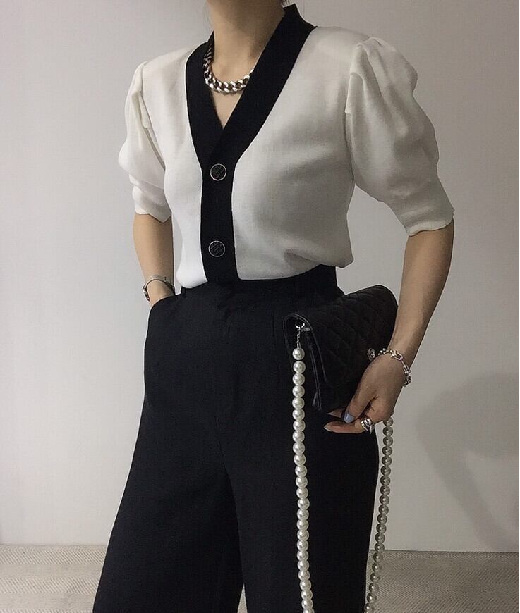 (4色選択可) トップス ニットソー 5分袖 パフスリーブ Vネック リブ 前開き 大人可愛い きれいめ 大人 上品 おしゃれ お洒落 かっこいい 大人女子 こなれ感 個性的 クール エレガント モダン 主役級 存在感 無地 春 秋 20代 30代 40代 50代 ビジネス OL 通勤 デート 旅行 高原 ホテル ガーデン レストラン 着回し モテ 体系カバー プチプラ 激安 トレンド 流行 インスタ映え ホワイト ブラック イエロー ピンク | Chère