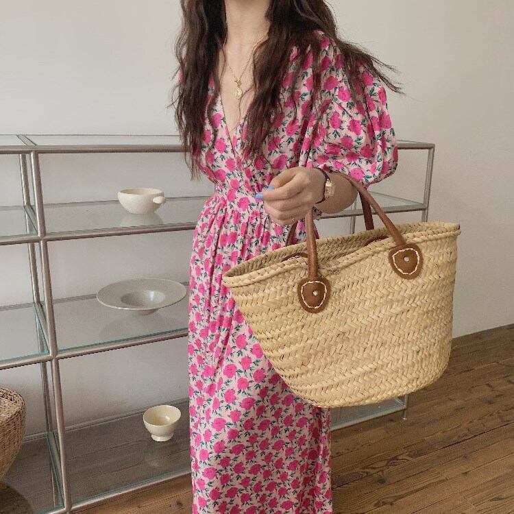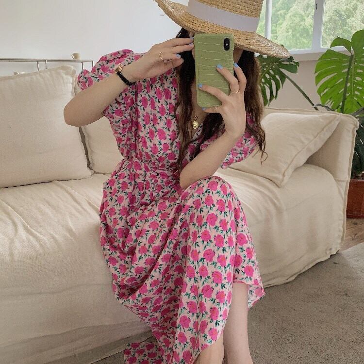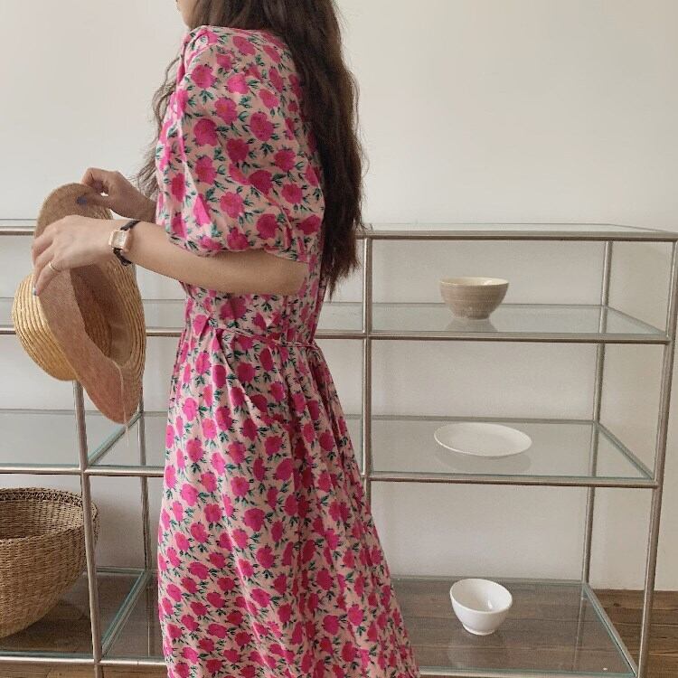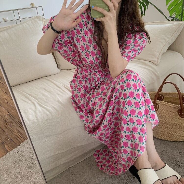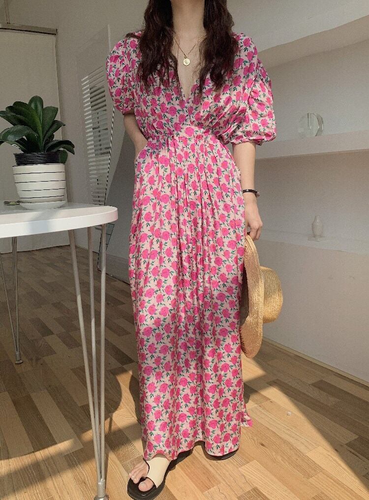 ワンピース ロングドレス 5分袖 パフスリーブ Vネック Aライン ウエストゴム コットン かわいい 大人可愛い きれいめ 大人 おしゃれ お洒落 レトロ 大人女子 こなれ感 ラフ ラブリー キュート ガーリー 個性的 セクシー 主役級 存在感 小花柄 10代 20代 30代 OL 通勤 学生 通学 デート お出かけ 休日 高原 ガーデン 韓国系 二の腕カバー モテ 高見え 格上げ トレンド 流行 インスタ映え 春 夏 ピンク | Chère