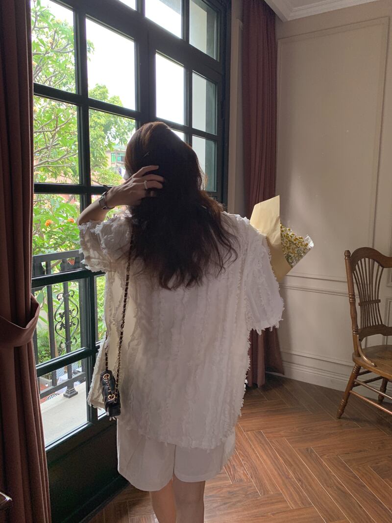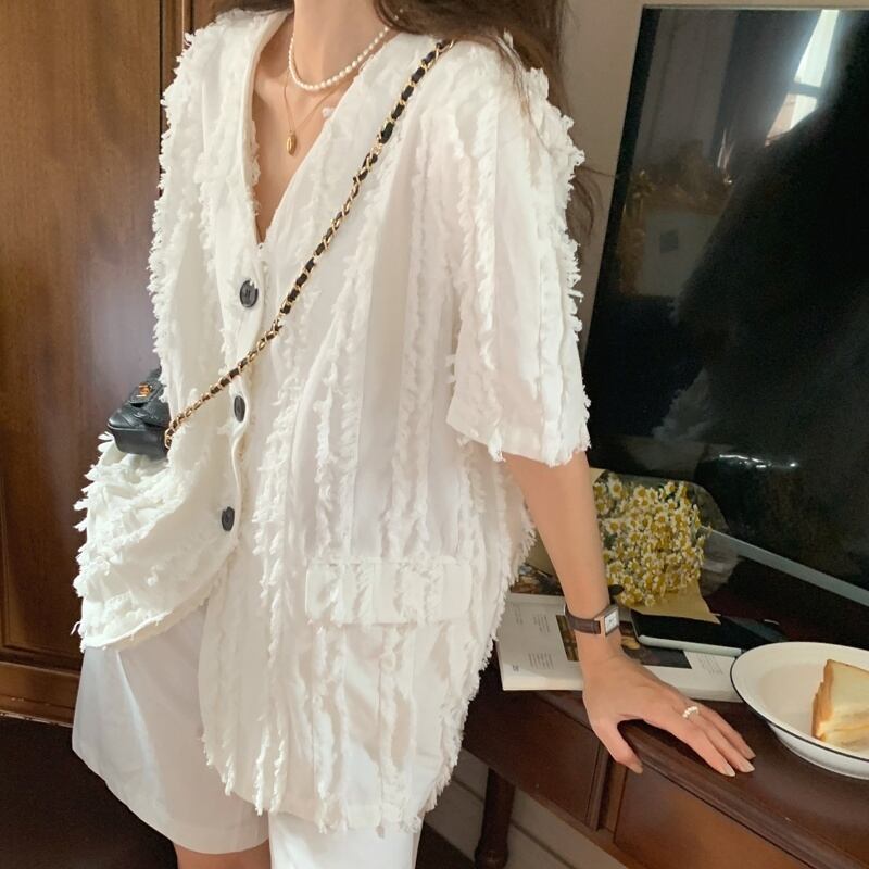 アウター ジャケット 半袖 Vネック ストレート 前開き かわいい 大人可愛い 大人 おしゃれ お洒落 かっこいい 大人女子 こなれ感 個性的 クール モード系 主役級 存在感 無地 春 夏 10代 20代 30代 40代 OL 通勤 学生 通学 デート お出かけ 高原 ガーデン 着回し 韓国系 オルチャン コーデ トレンド 流行 インスタ映え ゆったり ホワイト | Chère